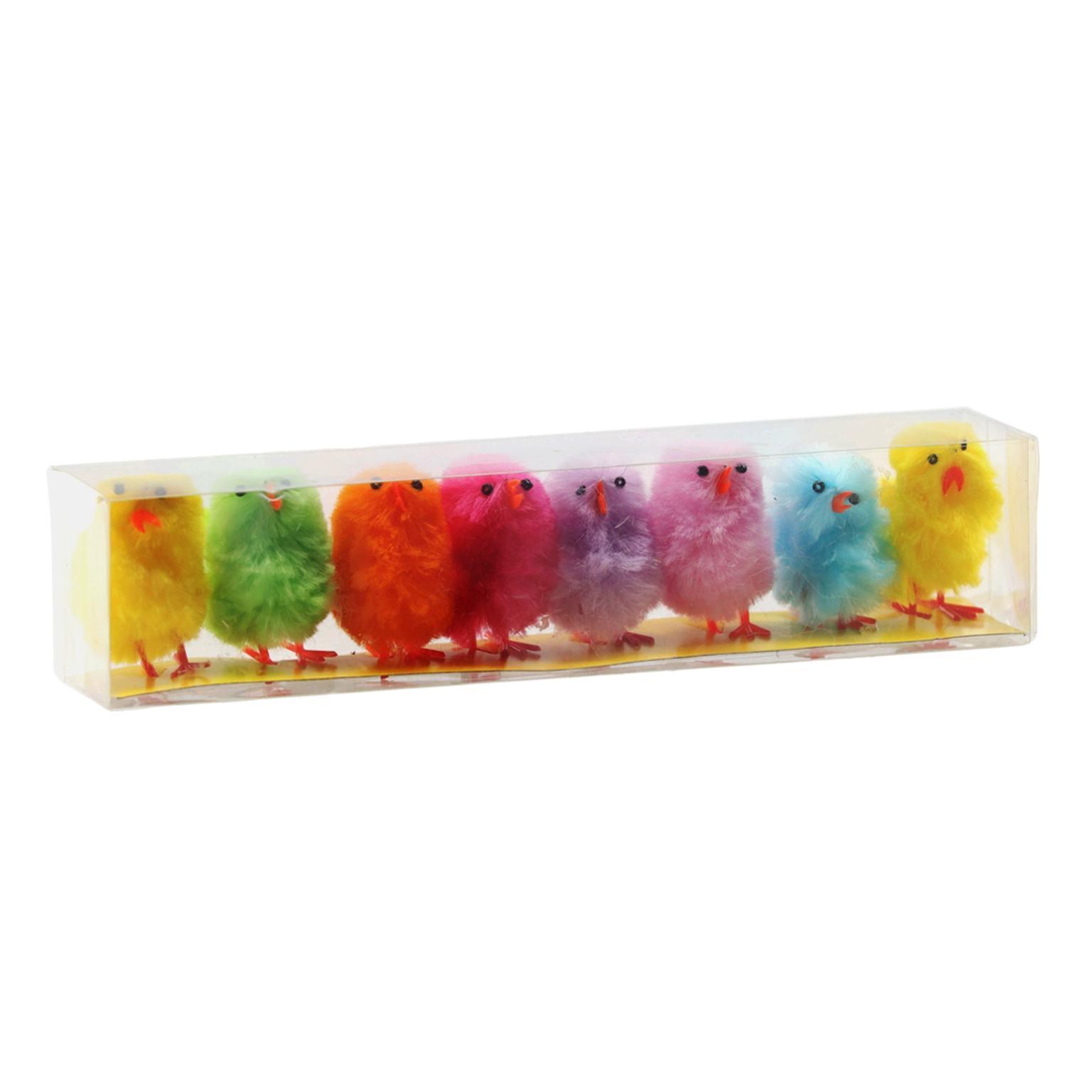 Geef je paasdecor een speelse sfeer met deze set van acht kleurrijke kuikentjes. Elk stuk heeft een zacht pluizig oppervlak, een klein snaveltje en oranje pootjes voor stabiel neerzetten. Perfect voor tafels, planken en lentearrangementen.
