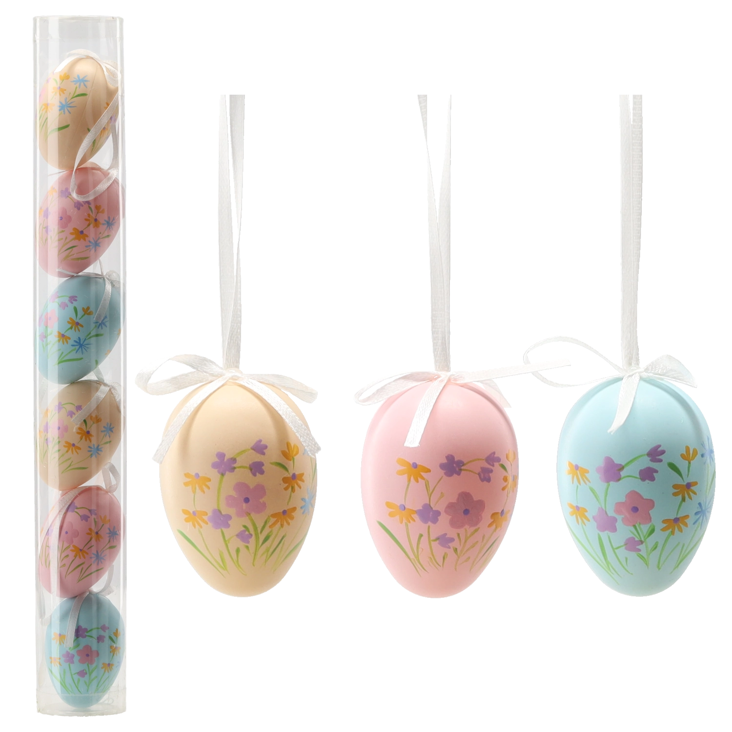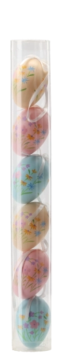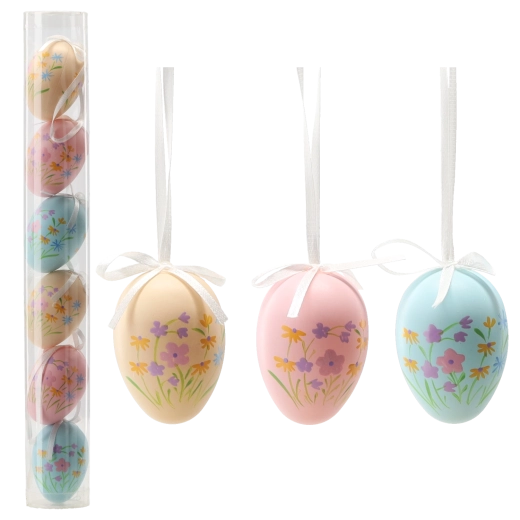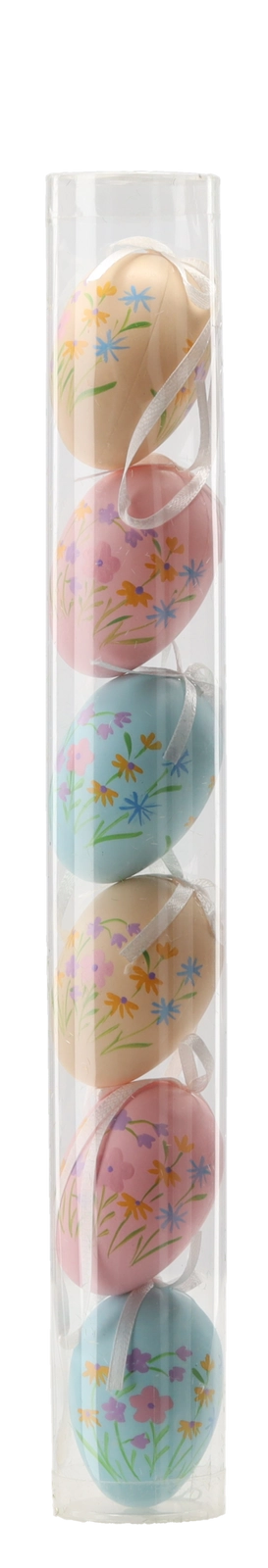 Stijlvolle set van zes paaseieren van 6 cm met subtiele bloemmotieven in pasteltinten die frisheid en een vrolijke sfeer in huis brengen. De eieren zijn gemaakt van licht, duurzaam plastic, hebben een praktisch ophanglusje en worden geleverd in een transparante tube voor eenvoudige opslag. Ideaal voor het decoreren van takjes, slingers en lentearrangementen. Pastelkleurige bloemmotieven, duurzaam plastic, ophanglusje, verpakt in tube.