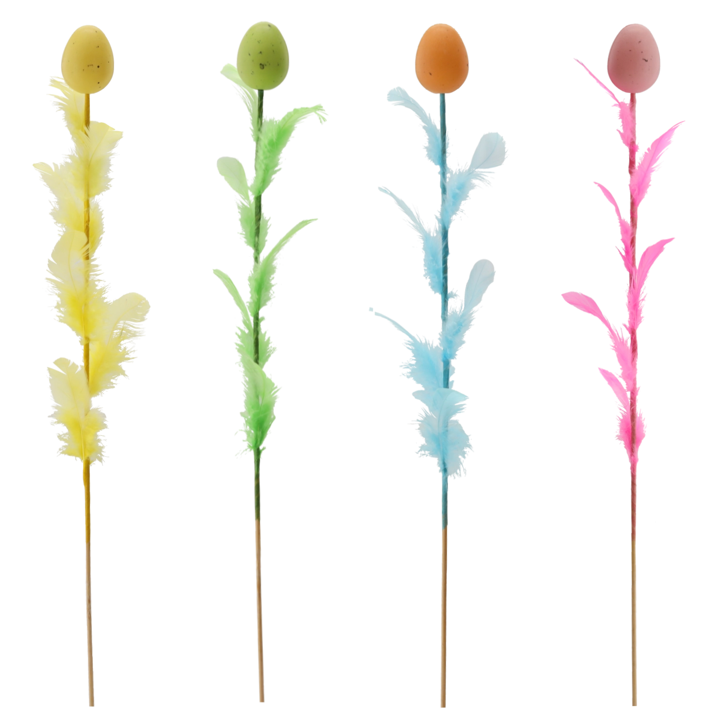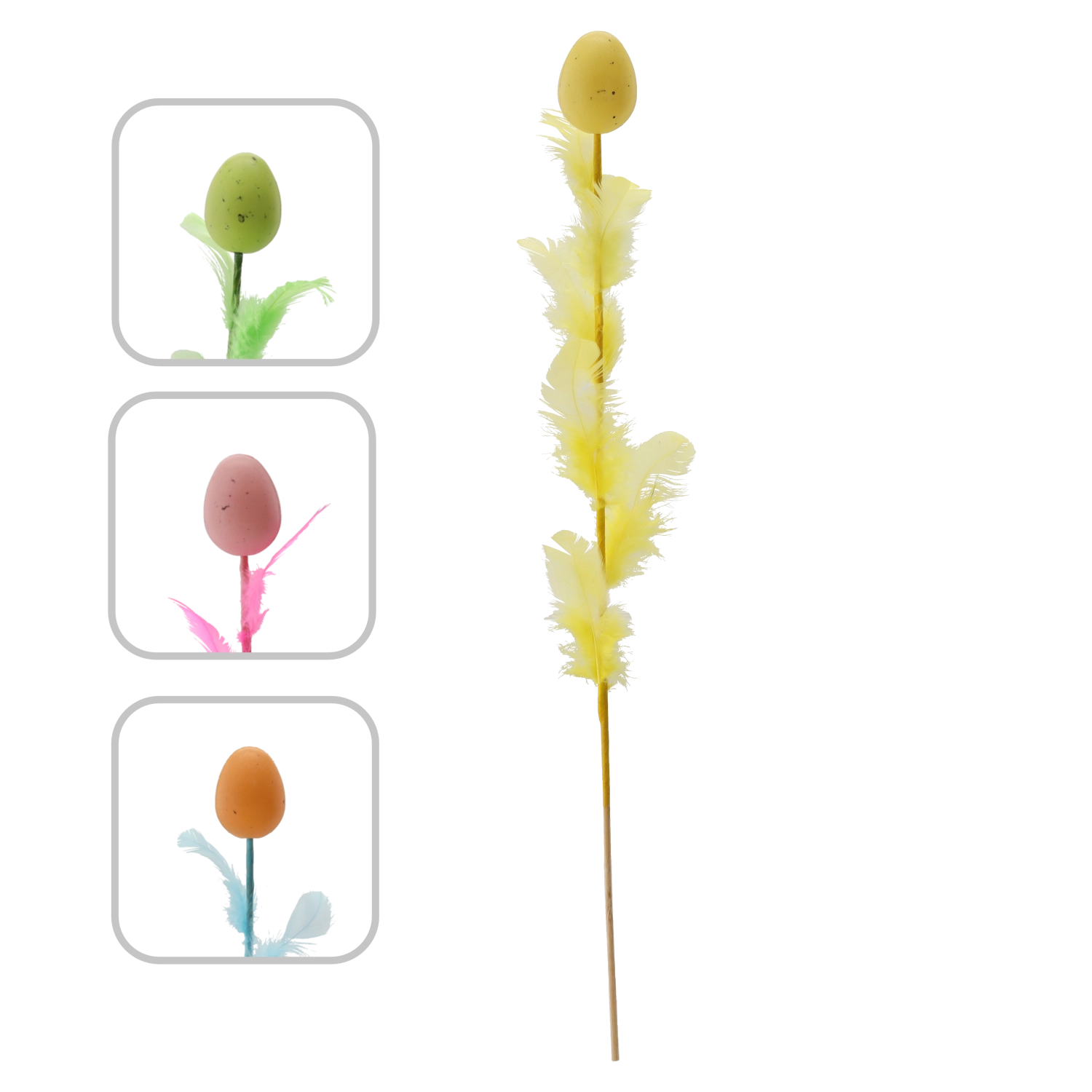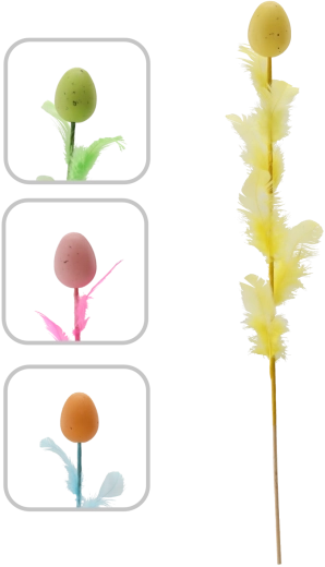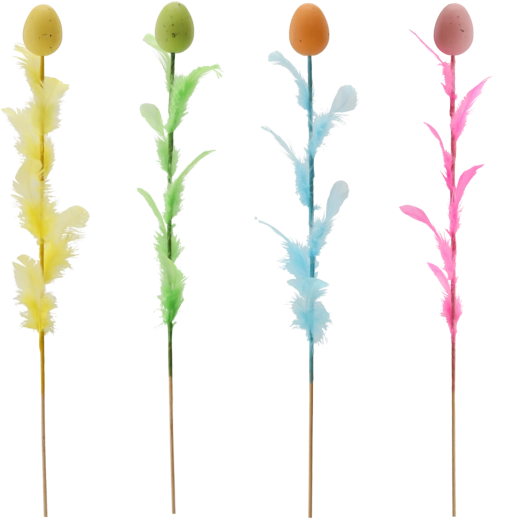 Elegante paasdecoratie in de vorm van een ei met veertjes op een prikker van 45 cm die je feestelijke arrangementen laat stralen. Beschikbaar in een mix van vier frisse kleuren die je interieur kleur en een lenteachtige sfeer geven. Fijne veertjes voor lichtheid en luchtigheid maken het een ideale keuze voor boeketten, mandjes en vazen.