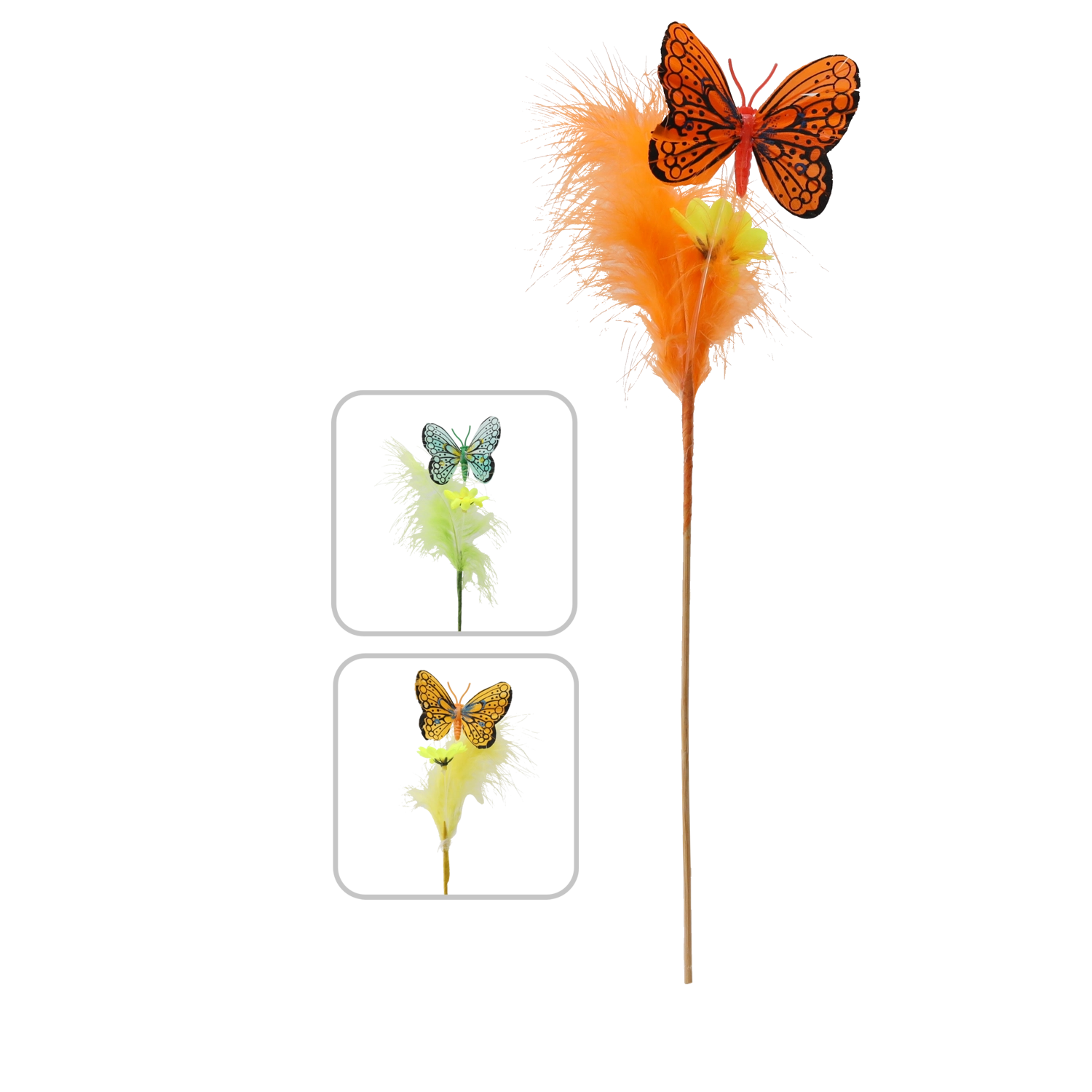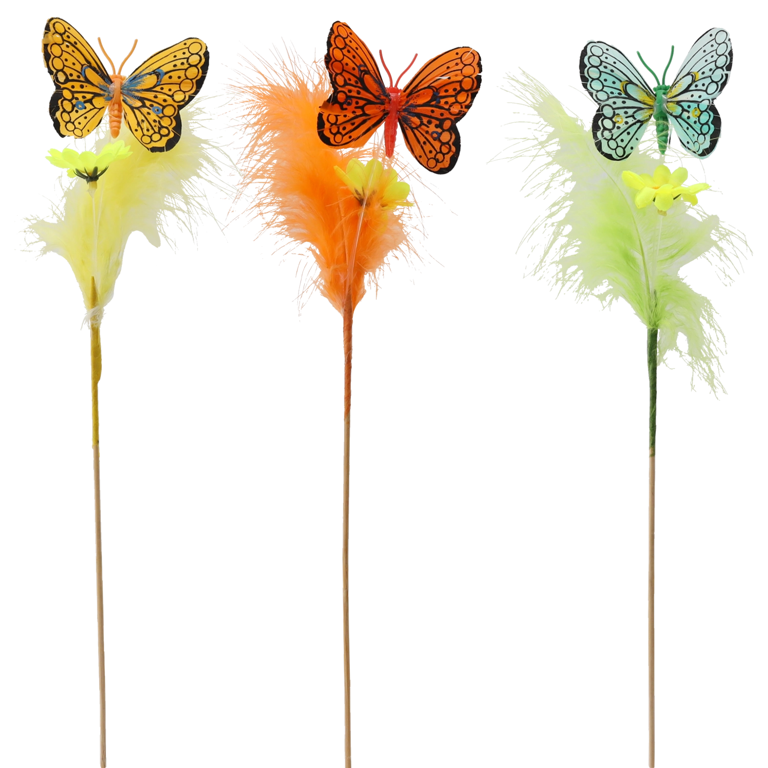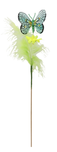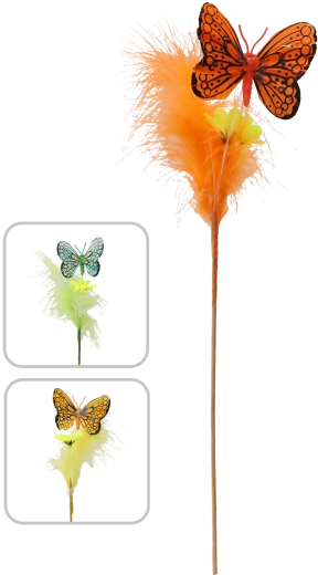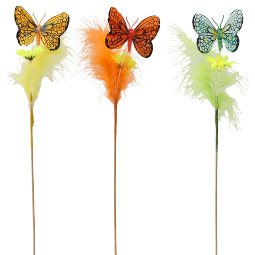 Creëer thuis een lentesfeer met een vlinderdecoratie op een prikker, versierd met veertjes. Deze charmante ornamenten in een mix van 3 pastelkleurige tinten passen moeiteloos in elk interieur en benadrukken uw paasversiering. Dankzij de houten prikker plaatst u ze in een handomdraai in bloemarrangementen, kransen of mandjes.