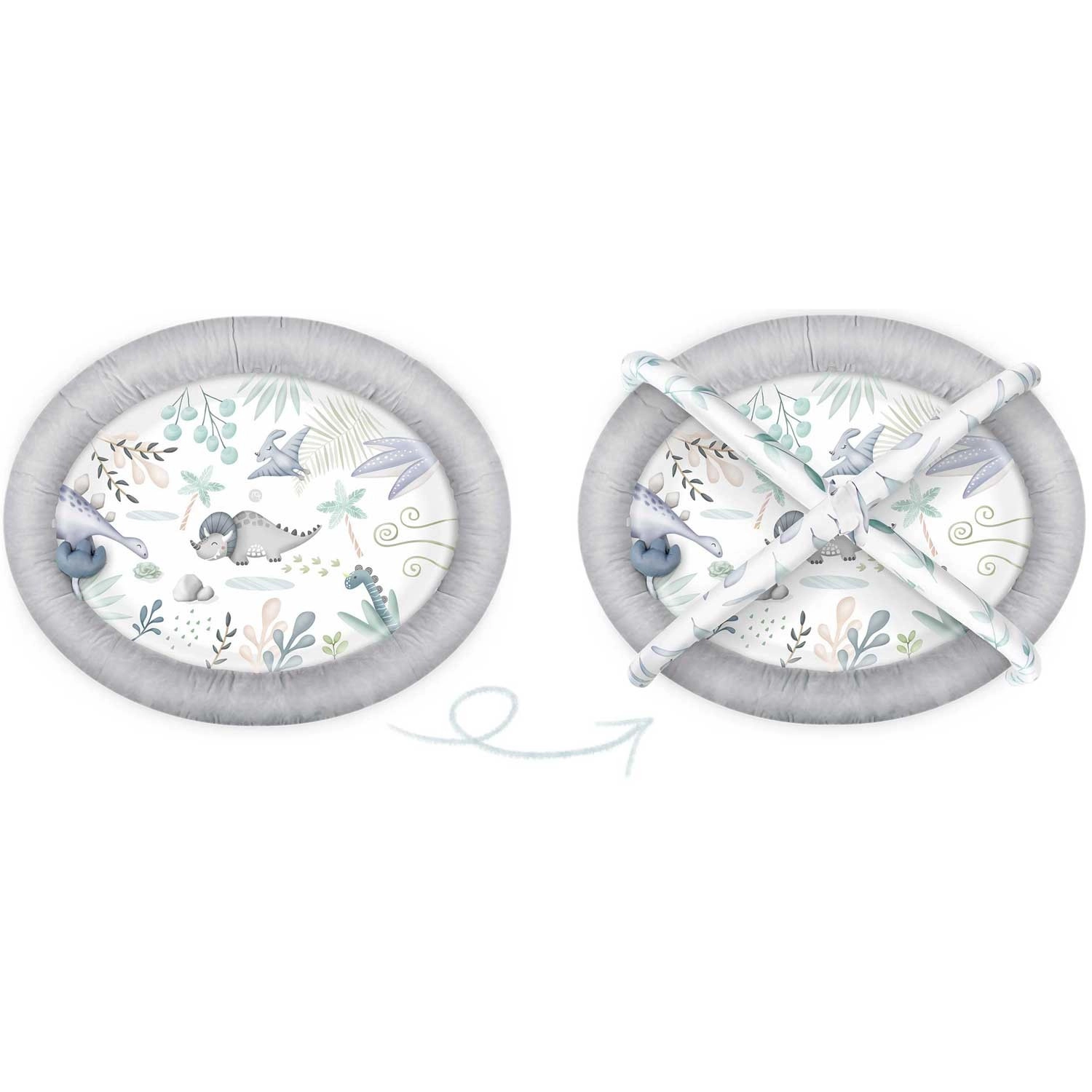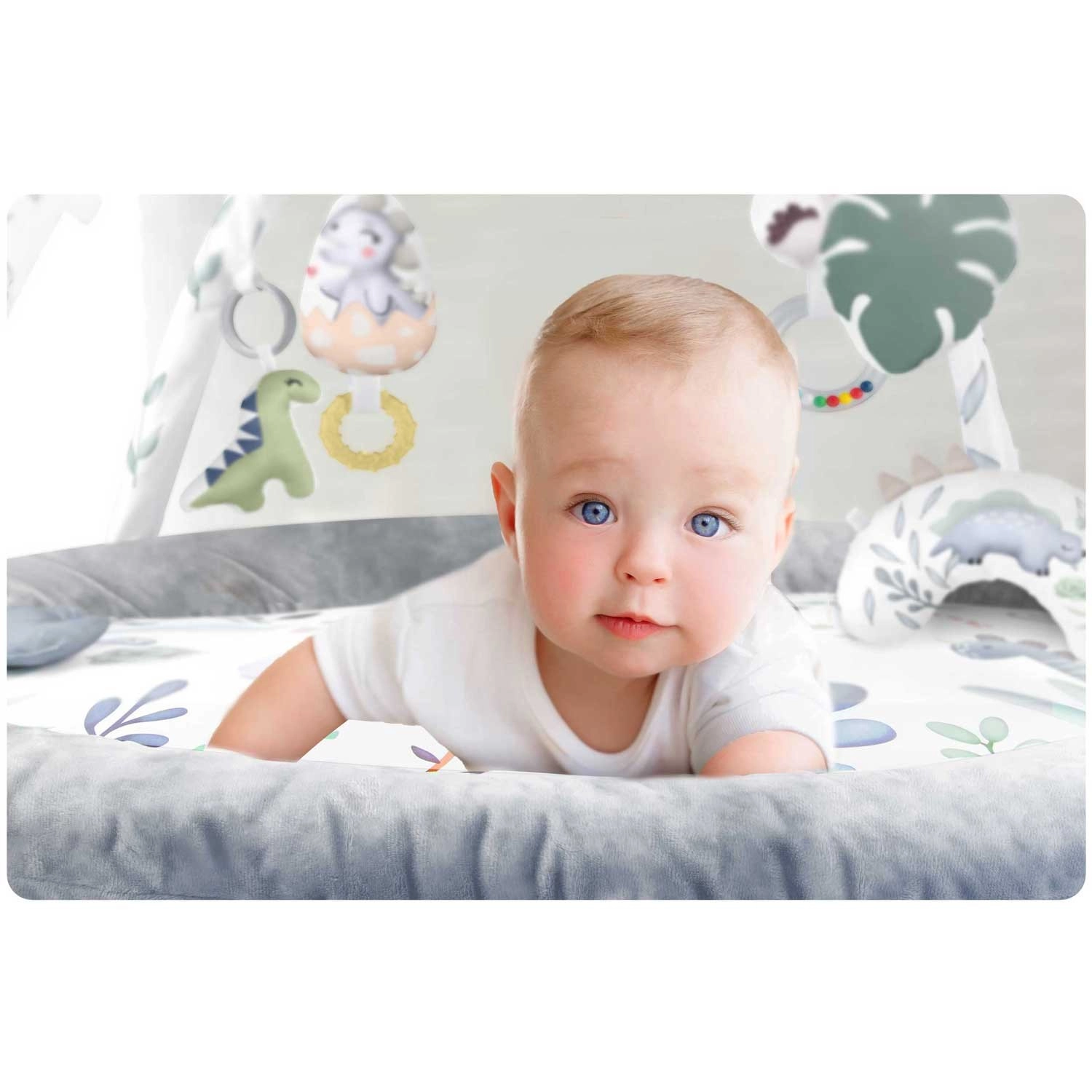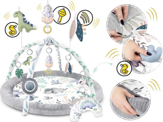 De twee kruisende bogen zijn afneembaar voor langer gebruik van de mat – als speeloppervlak én als los nestje. Inclusief een heerlijk zacht kussentje (achterzijde van minky) ideaal voor tummy time, waaraan je speeltjes kunt bevestigen. Diverse texturen, knisperende details, rammelaars, bijtringen en een piepende dinosaurus stimuleren samen de fijne motoriek, oog-handcoördinatie en gehoors- en tastprikkels.