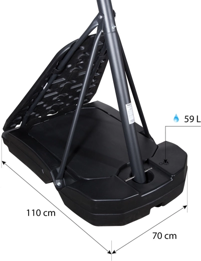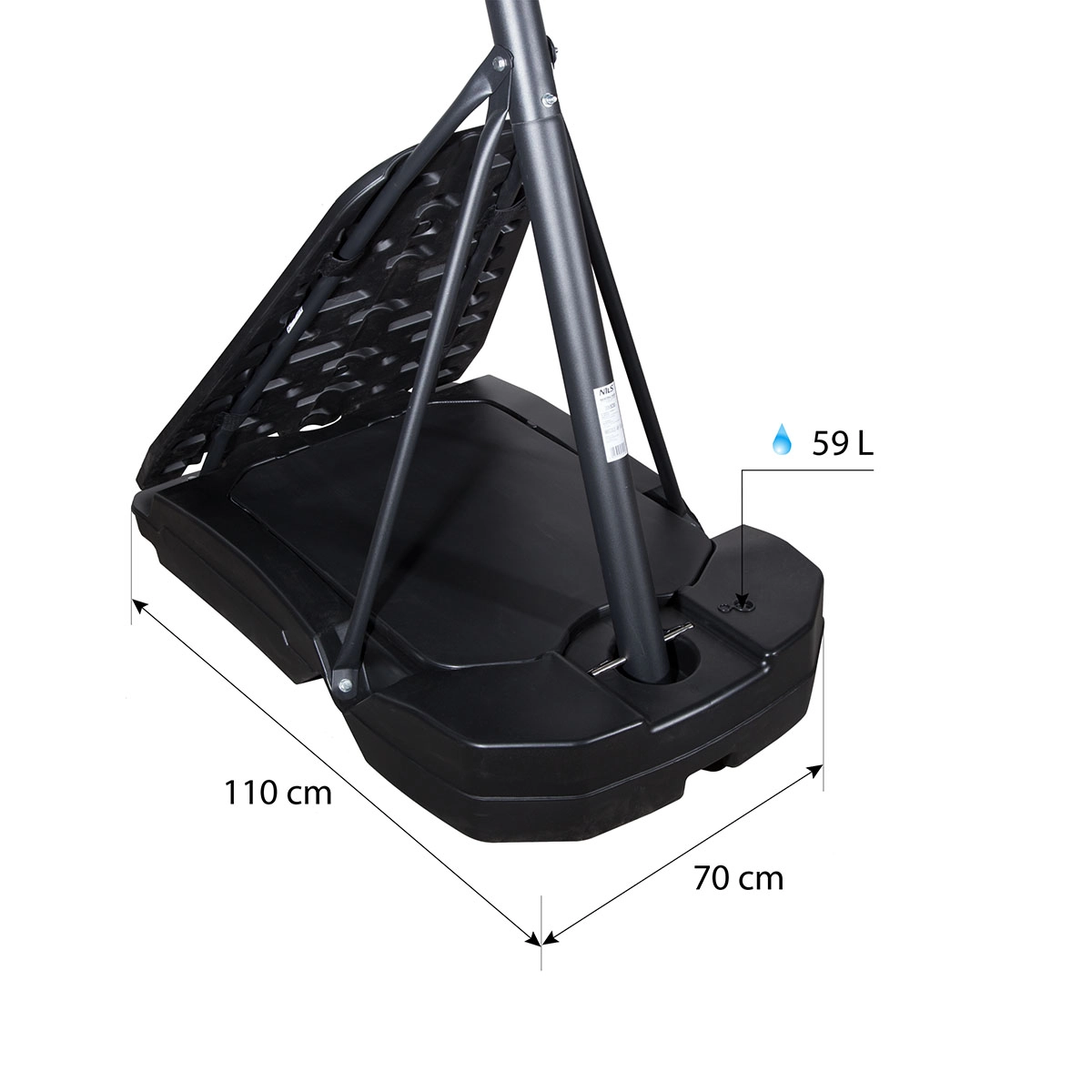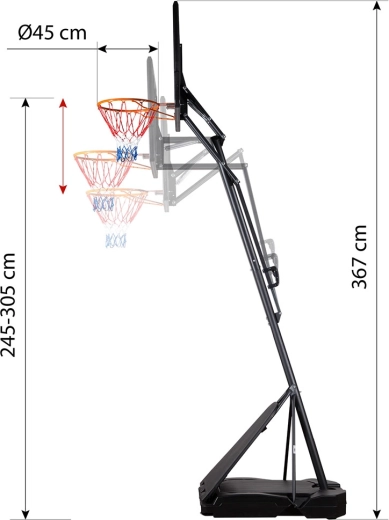 De basis met afmetingen 110 × 70 cm biedt plaats aan 59 liter water voor maximale stabiliteit en is uitgerust met wielen voor eenvoudige bediening. Onder het bord bevindt zich een reboundvlak voor het trainen van passes. De ring met een diameter van 45 cm is geveerd met 2 sterke veren, wat de levensduur verlengt en het speelgevoel verbetert.