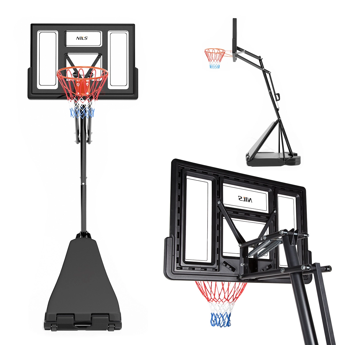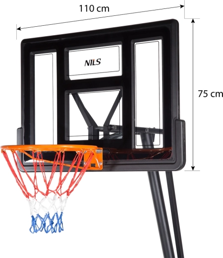 Robuuste basketbalring NILS ZDK520 voor buiten en binnen met een verstelbare ringhoogte van 2,45–3,05 m, een duurzaam, transparant bord van 110 × 75 cm en een stalen geveerde ring Ø 45 cm. Stabiliteit wordt verzekerd door een basis voor 59 l water met wieltjes voor eenvoudig verplaatsen en een reboundbord voor het trainen van passes.