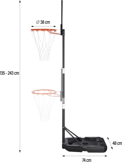 Geniet overal van basketbal met de draagbare NILS ZDK001. Biedt een traploos verstelbare hoogte van 135–243 cm, een schokbestendig polycarbonaat backboard, een duurzame stalen ring van 38 cm en een stabiele basis met wieltjes voor eenvoudig verplaatsen. Ideaal voor kinderen, tieners en volwassenen in de tuin, oprit of bij de vakantiewoning.