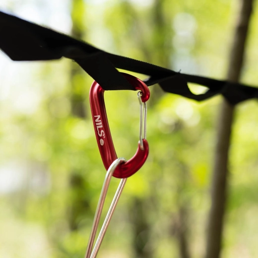 De elegante rode uitvoering met NILS-logo en ergonomische D-vorm garandeert comfortabele bediening. Anodisatie beschermt tegen oxidatie, zodat de karabiner langdurig functioneel en fraai blijft, zelfs bij veelvuldig buitengebruik.