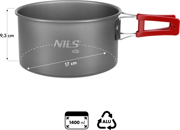 De NILS Camp pan met een inhoud van 1400 ml is ontworpen voor comfortabel koken in de natuur – van snel water koken tot het bereiden van soep of pasta voor één tot twee personen. De constructie uit drie materialen – aluminium, roestvrij staal en ABS – zorgt voor hoge duurzaamheid, efficiënte warmteverdeling en een veilige grip.
