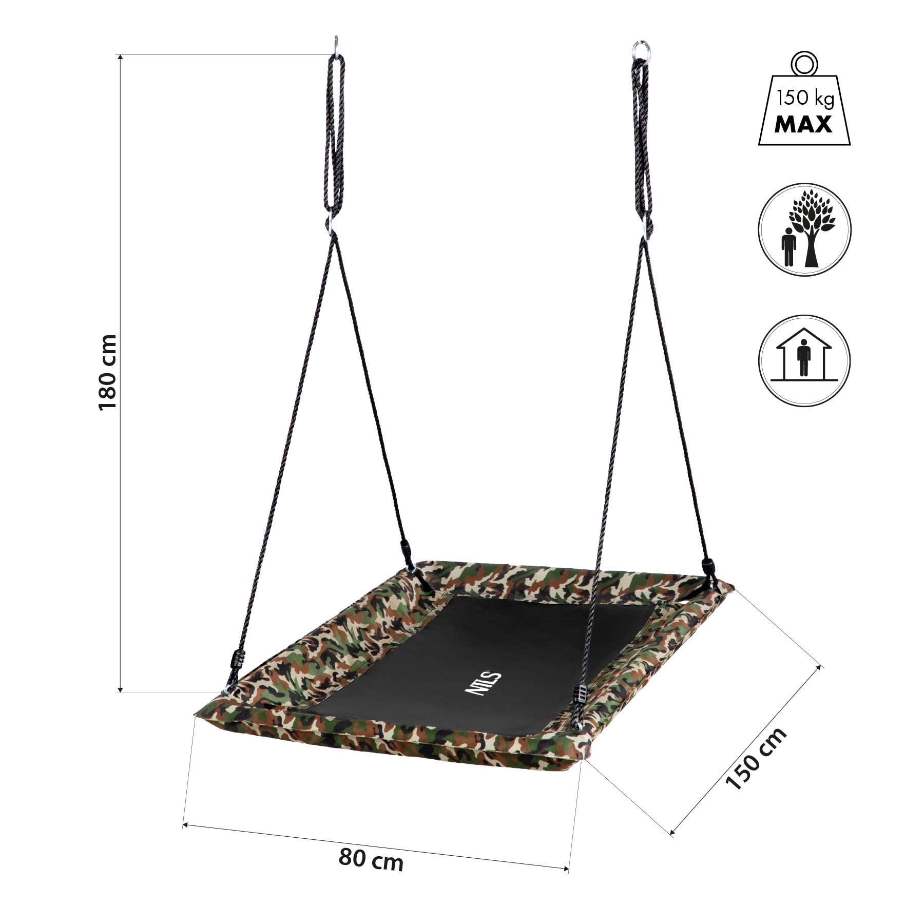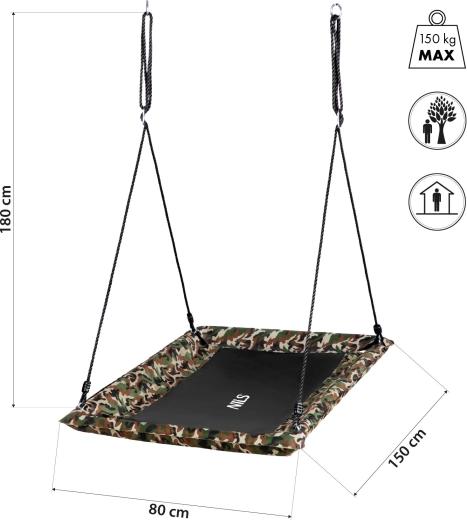 Dankzij de rechthoekige vorm van 150 × 80 cm krijg je meer bruikbaar oppervlak dan bij klassieke ronde modellen. De schommel is comfortabel voor één of twee personen – ideaal voor broers en zussen of gezamenlijke momenten van ouder en kind. Verstelbare touwen tot 180 cm maken montage aan een constructie, balk of tak eenvoudig.