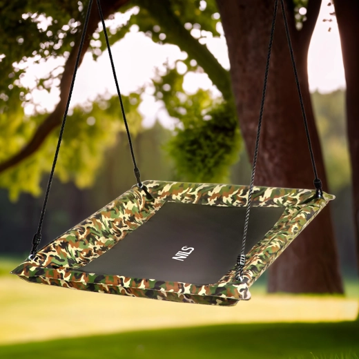Het schommelplatform met een stalen frame en een zitvlak van slijtvaste 600D Oxford-stof combineert duurzaamheid met comfort. Materialen die bestand zijn tegen uv-straling en regen zorgen voor een lange levensduur en eenvoudig onderhoud. Het camouflagedesign geeft je tuin stijl en spreekt kinderen aan door zijn speelse uitstraling.