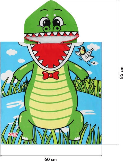 De schattige kinderponcho met capuchon NILS Aqua Crocodile is ideaal na het baden thuis, bij het zwembad en aan zee. Biedt snelle afd emping, hoge absorptie en sneldrogende eigenschappen. De lichte ponchosnit geeft kinderen vrije bewegingsruimte, terwijl de capuchon het hoofd en haar beschermt tegen kou en tocht. De compacte afmetingen maken het een praktische reisgenoot.
