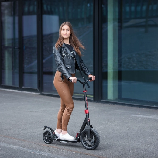 Het voorwiel van 300 mm en het achterwiel van 200 mm met luchtbanden dempen trillingen op kasseien en ongelijk asfalt uitstekend en zorgen voor een stille, soepele rit door de stad.