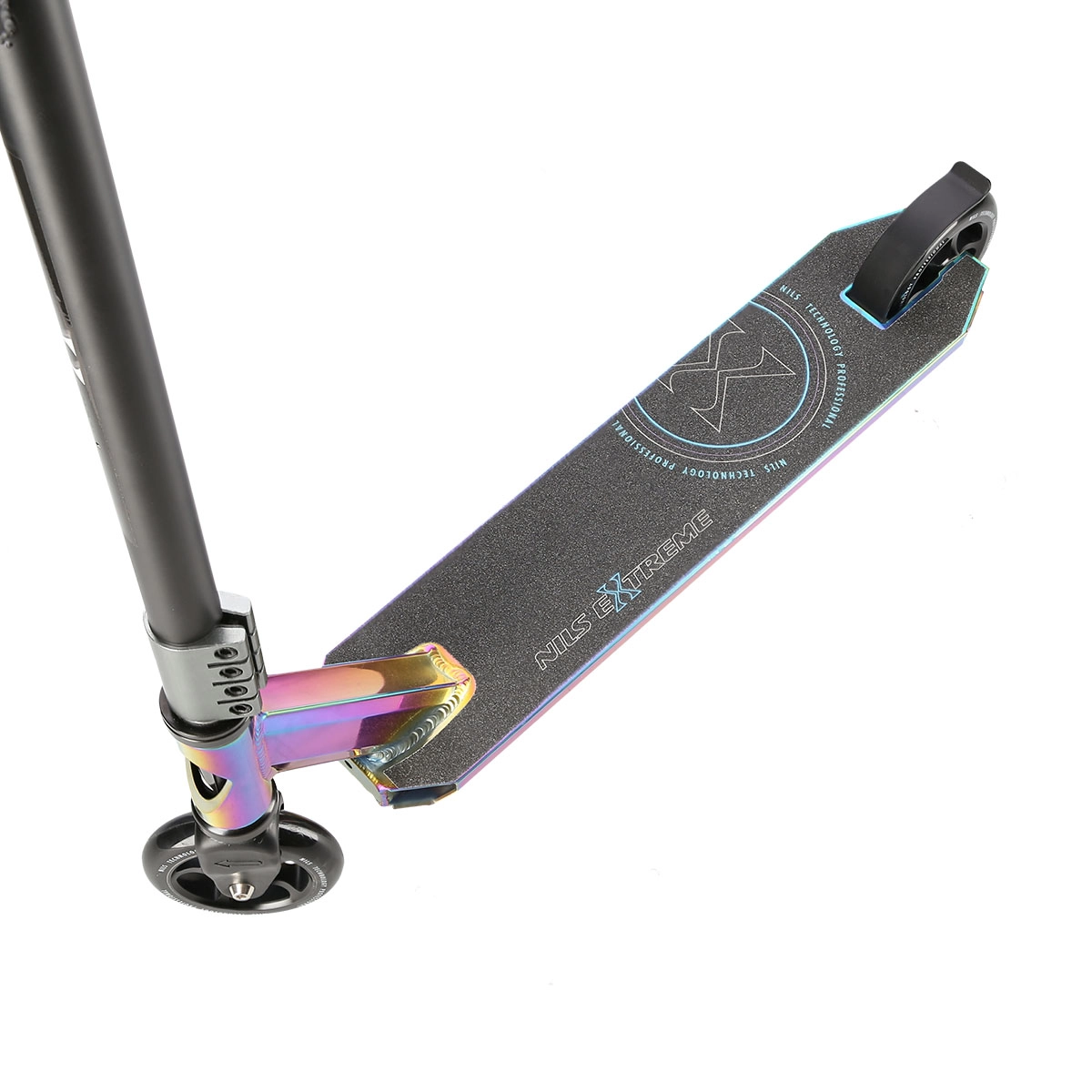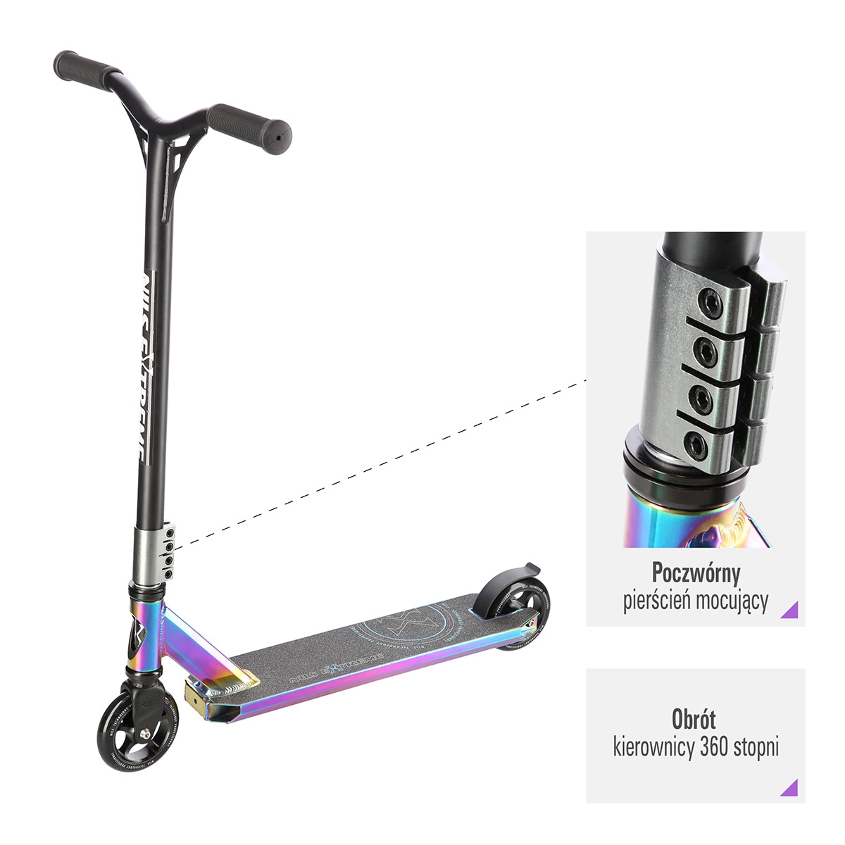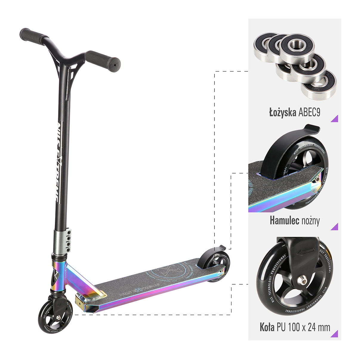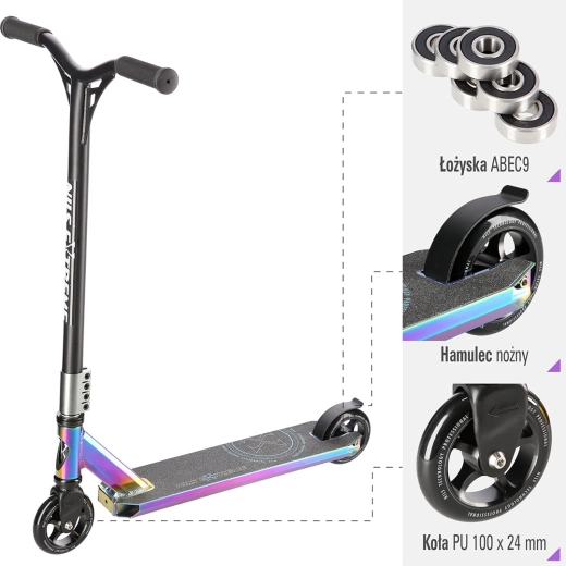 De kleine en snelle PU-wielen 100 × 24 mm met precieze ABEC 9-lagers zorgen voor vlotte acceleratie en soepel rijden. Het stuur met 360° rotatie maakt onbeperkte trickcombinaties mogelijk, terwijl de achterste voetrand- (spatbord)rem voor veilig en direct remmen zorgt.