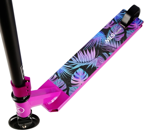 Zoek je een betrouwbare step voor zowel skatepark als straat? Dit model van NILS Extreme met Leaves-motief is gebouwd op een stevig driekamer aluminium deck en brede, draadloze sturen die met een drieschroefsklem worden vastgezet voor maximale stijfheid. Het ontbreken van een vouwmechanisme en hoogteverstelling garandeert een hogere duurzaamheid van de hele constructie bij het uitvoeren van tricks.