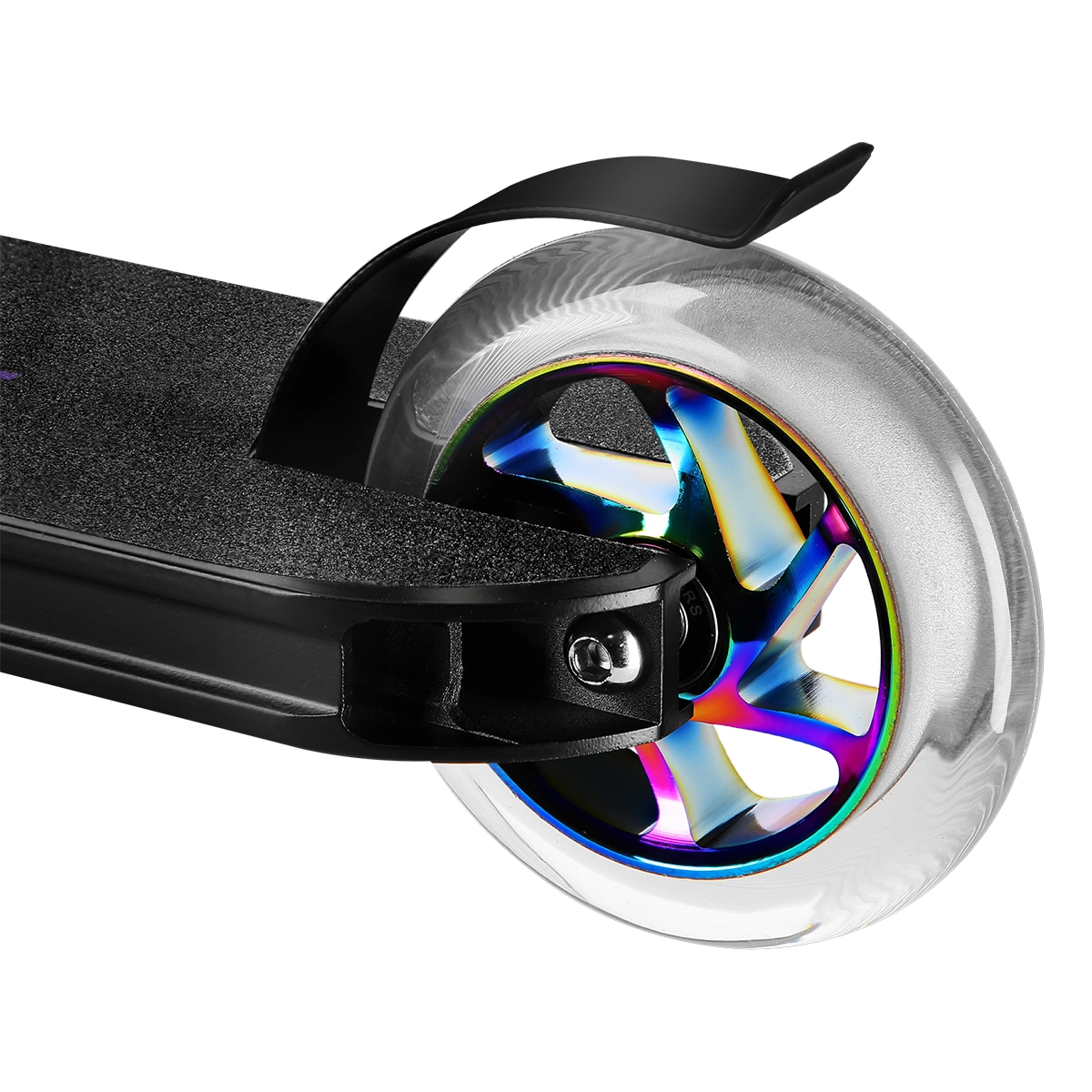 Een soepele en vlotte rit wordt geleverd door wielen van 110 x 24 mm met ABEC 9-lagers, terwijl de achterste voetrem van het type flex fender directe en veilige stopkracht biedt. Het vijfkamer aluminium deck, de brede T-bar met rubberen grips en de geperste IHC-headset geven de step stabiliteit, nauwkeurige besturing en een vloeiende 360°-rotatie van het stuur.
