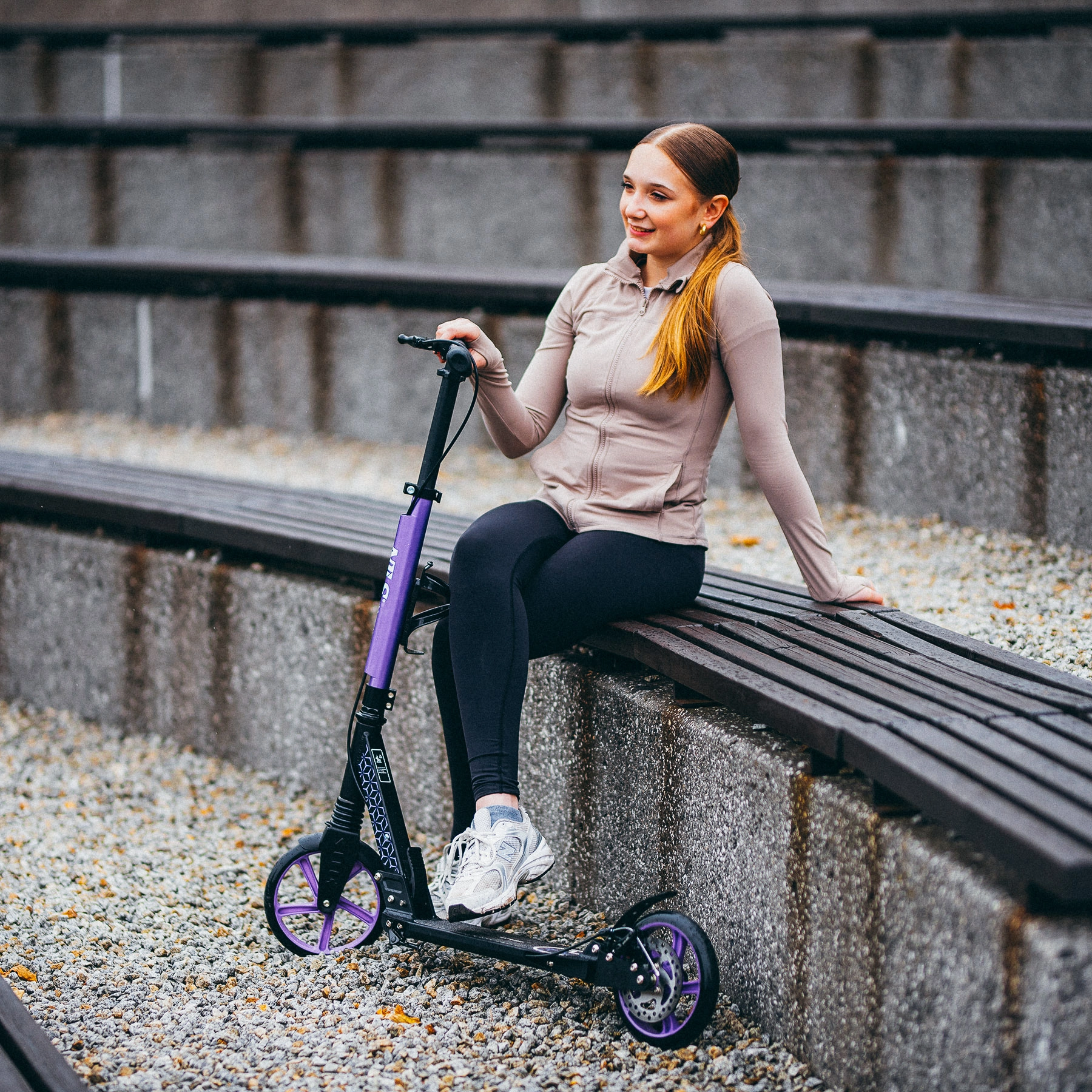 Snel vouwmechanisme voor eenvoudig transport en opbergen. Drie stuurhoogtes (93–110 cm) voor comfortabele afstelling op de lengte van de rijder.