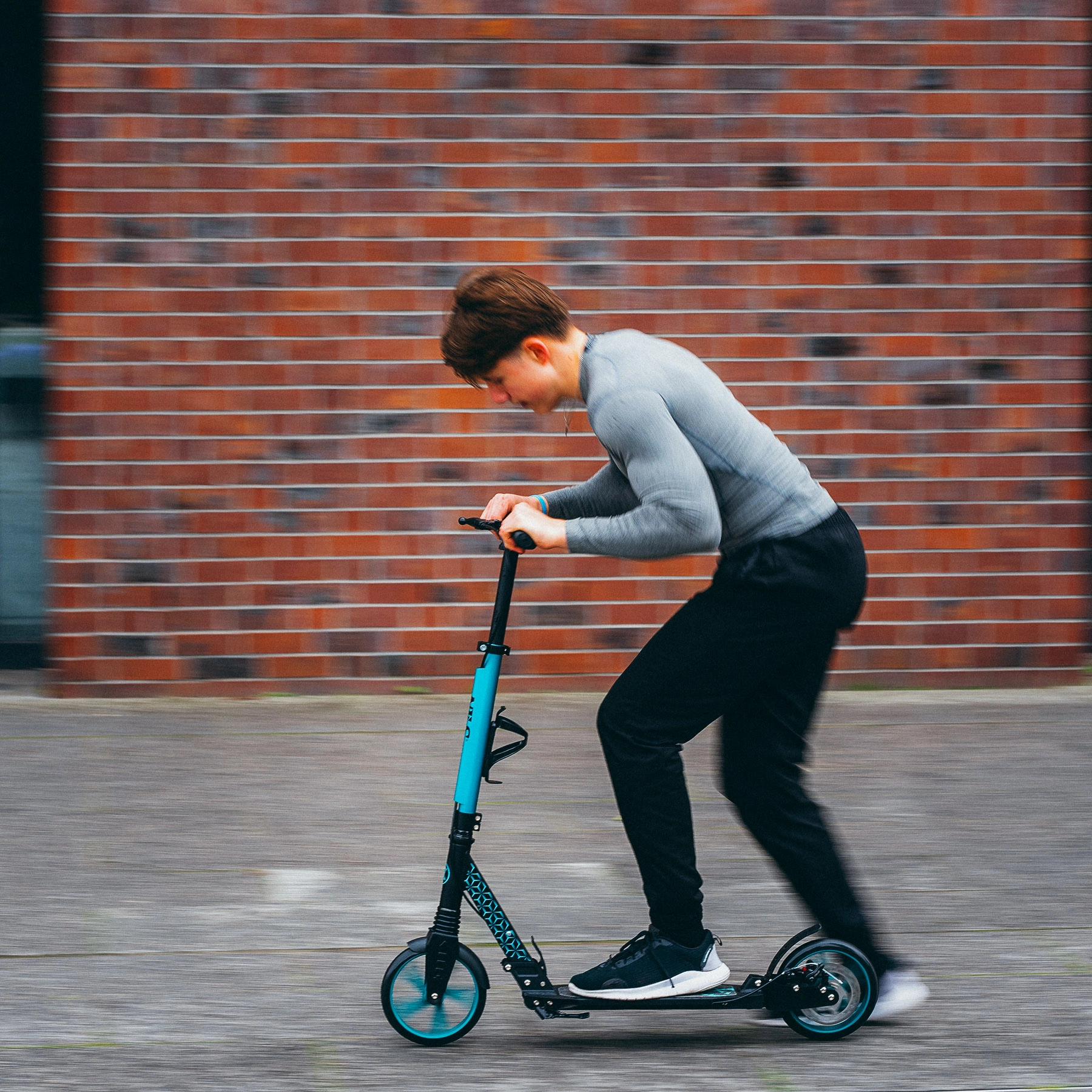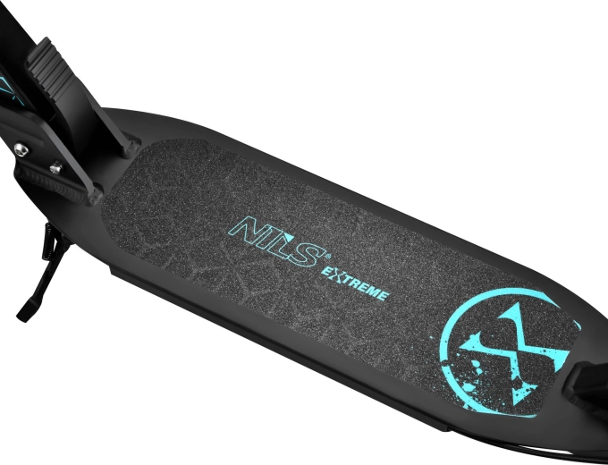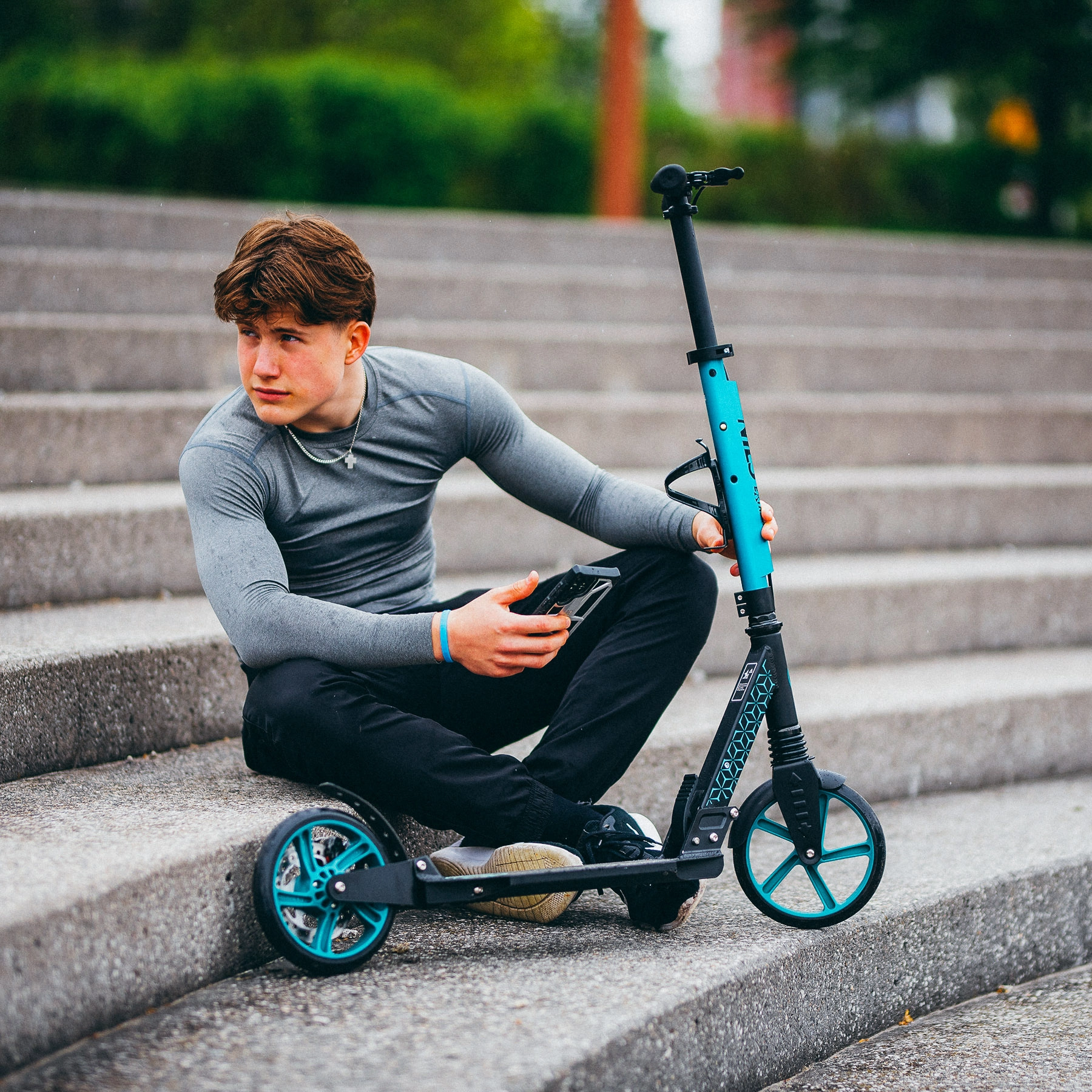 De NILS Extreme HM124T step in turquoise combineert modern design, hoogwaardige afwerking en veiligheid. Dankzij het lichte aluminium frame is hij eenvoudig te dragen, terwijl hij stevig en betrouwbaar blijft. Grote polyurethaan wielen met een diameter van 200 mm en precieze ABEC 7-lagers zorgen voor een vloeiende en stille rit op asfalt en verharde trottoirs.