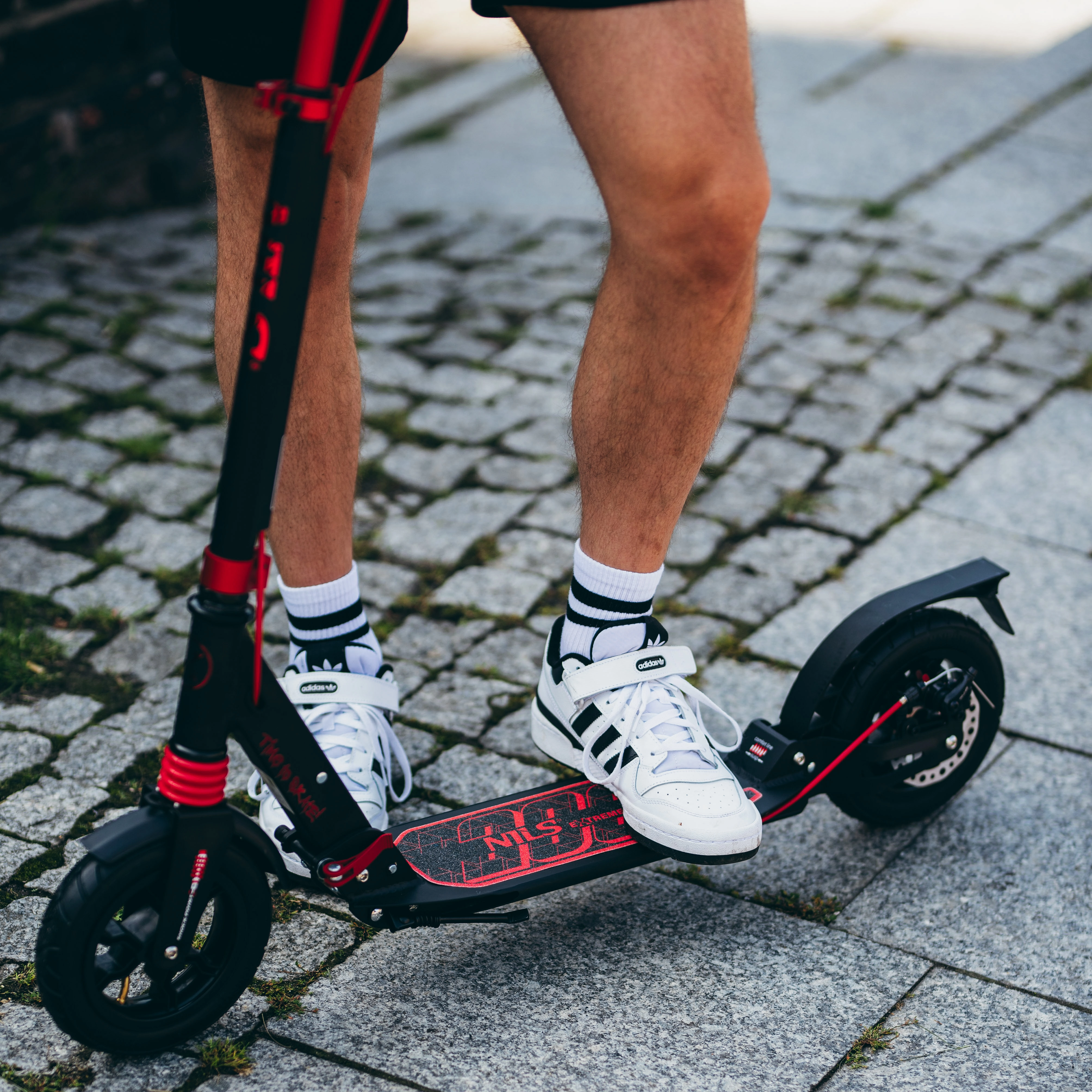 De NILS Extreme HM209T is de ideale keuze voor stedelijke rijders die comfort, veiligheid en compactheid willen combineren. Opblaasbare banden met een diameter van 200 mm in combinatie met voor‑ en achtervering dempen oneffenheden en zorgen voor een soepele rit. ABEC9‑lagers geven een lichte, vloeiende afzet, terwijl het brede aluminium dek van 61 × 15 cm met griptape zekerheid en stabiliteit biedt.