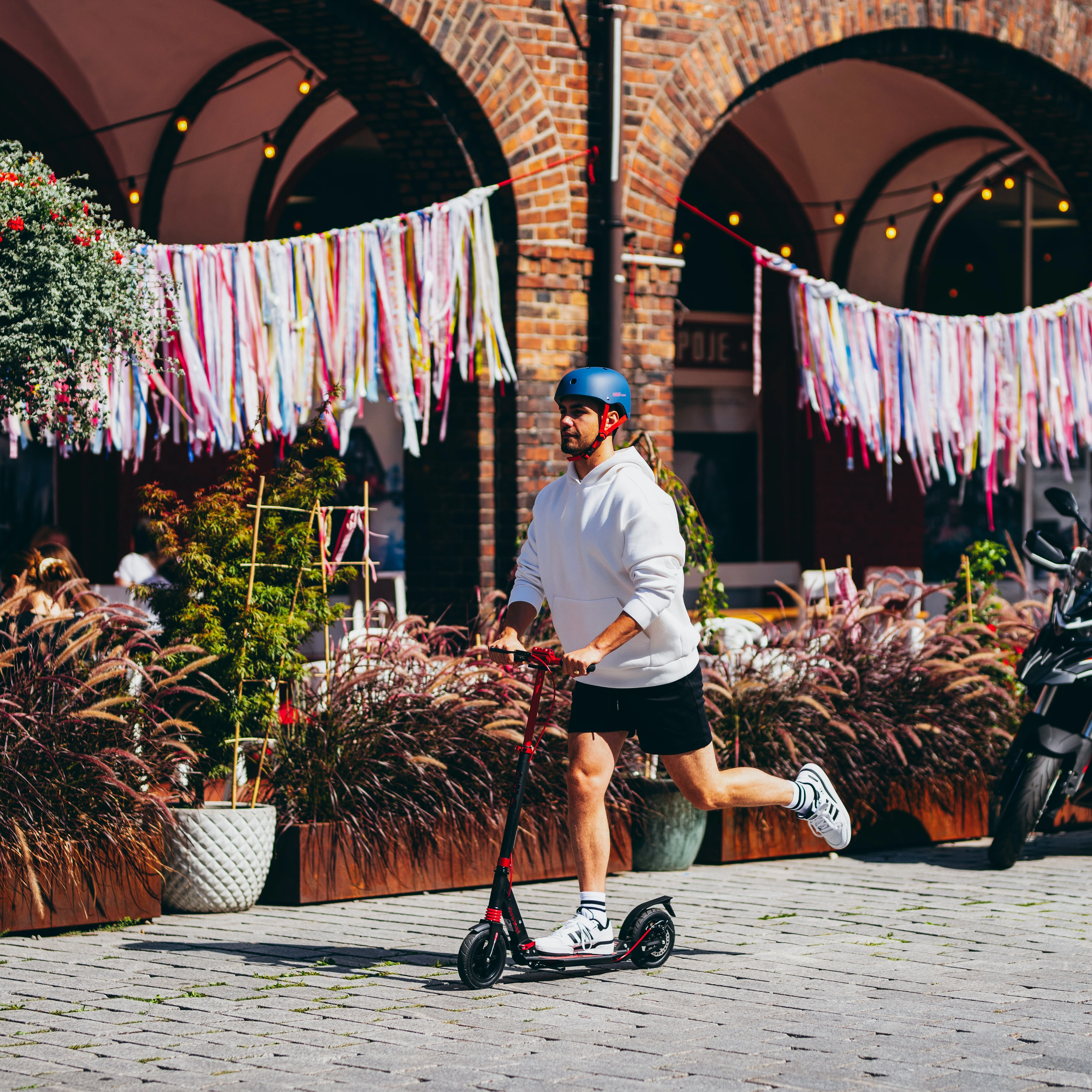 De voor‑ en achterdemper absorberen effectief oneffenheden in de stadsstraten. In combinatie met de 200 mm opblaasbare wielen rijd je vloeiender en met minder vermoeidheid.