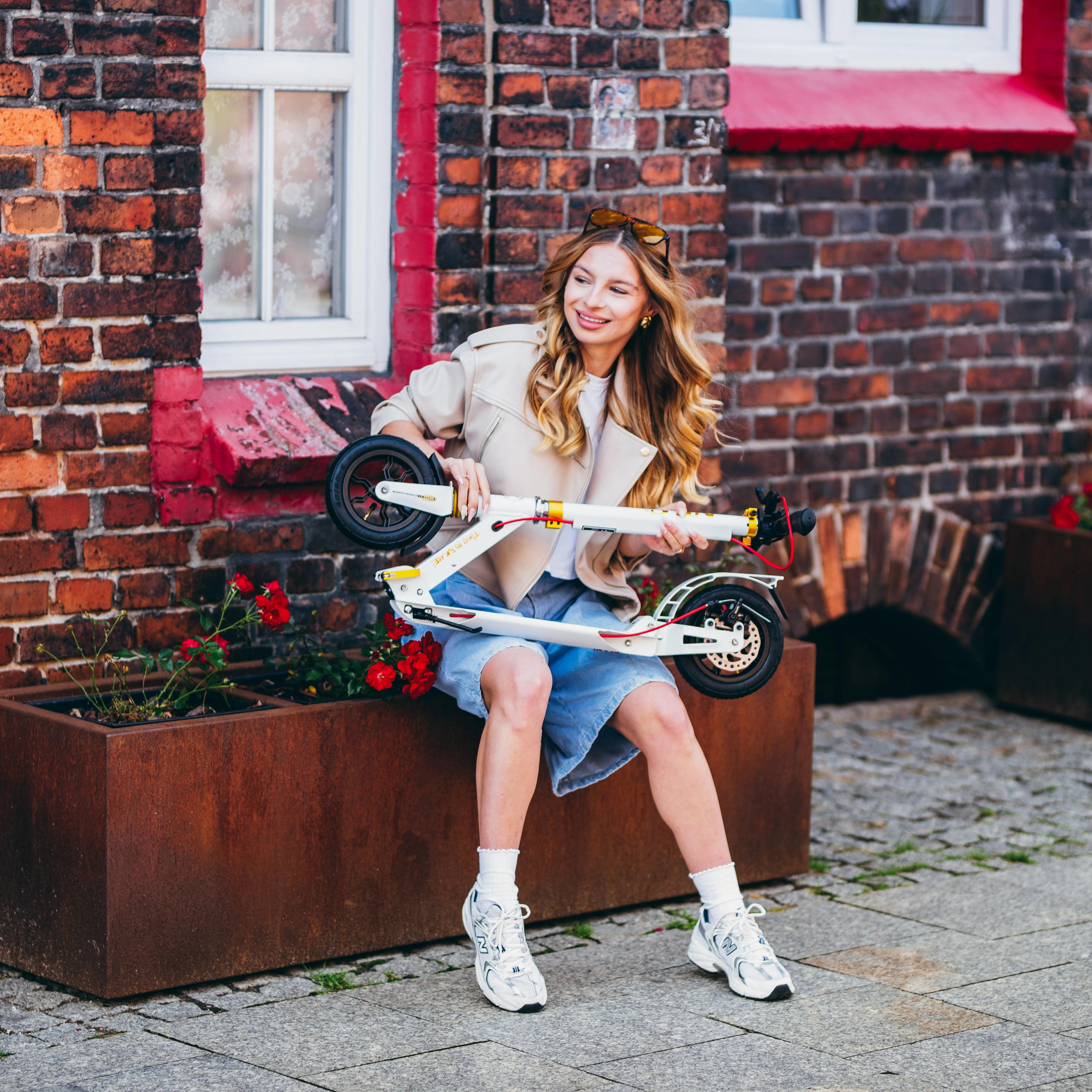 De voor- en achterdemper in combinatie met de opblaasbare 200 mm wielen absorberen oneffenheden en vergroten het comfort en de stabiliteit tijdens stedelijke ritten.
