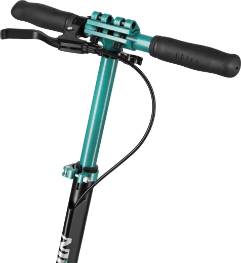 Voor een soepele rit op trottoirs en ruwere ondergrond is hij uitgerust met 200 mm PU-wielen, precieze ABEC 9-lagers en voorvering. Het brede antislip deck van 46 × 12 cm biedt een stabiele stand en ergonomische TPR-grips zorgen voor een zekere greep. De veiligheid wordt verhoogd door de combinatie van een achterste voetrem en een mechanische schijfrem bediend vanaf het stuur.