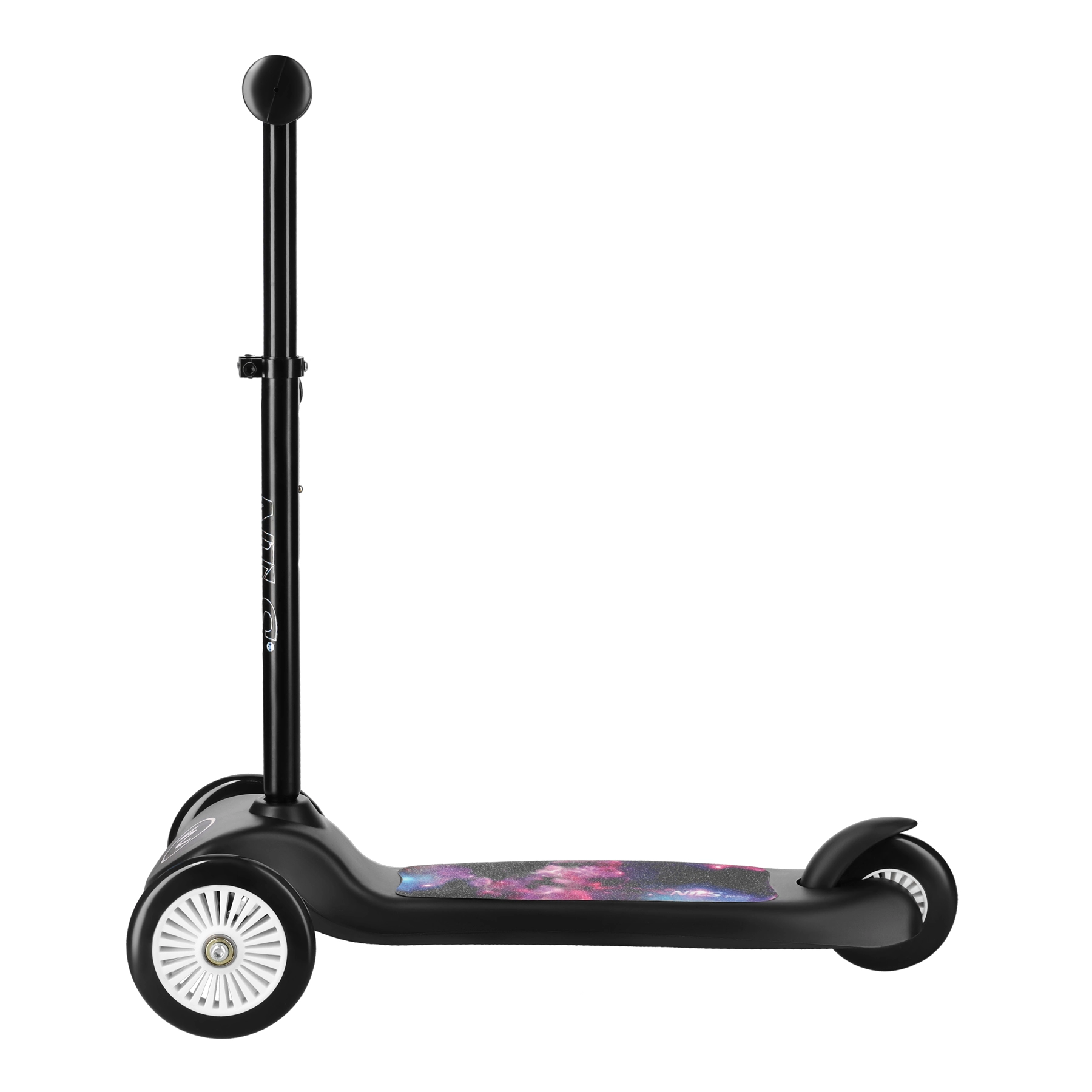 Het dek met een aantrekkelijk galaxymotief, wielen van duurzaam PVC en ABEC 5-lagers zorgen voor een soepele rit op het trottoir en licht oneffen terrein. De robuuste constructie van PP, aluminium en staal draagt tot 50 kg, waardoor de step jaren meegaat. Met een gewicht van slechts 2,1 kg is hij eenvoudig te dragen door zowel kinderen als ouders.