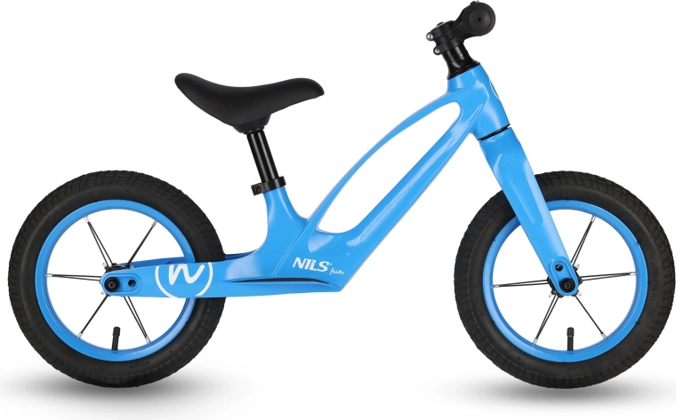 De NILS Fun RB901 loopfiets is ideaal voor de eerste fietsstapjes. Het lichte frame van magnesiumlegering (slechts 3,8 kg) combineert sterkte met een laag gewicht voor eenvoudige handling en beter balanceren. 12" luchtbanden dempen oneffenheden uitstekend en de kleurrijke LED‑verlichting in de wielen verhoogt de veiligheid en het plezier tijdens het rijden.