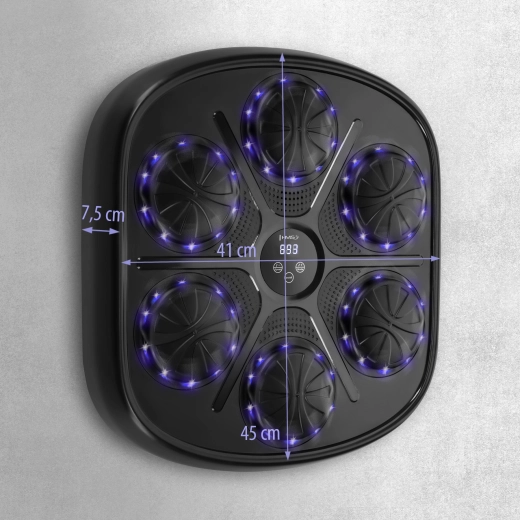 Dankzij Bluetooth en de ingebouwde luidspreker speel je tijdens de training je favoriete muziek af. Accuvoeding en USB‑C opladen maken dagelijks gebruik eenvoudig. Monteren gaat in een oogwenk: je bevestigt het schild met klittenband en stickers zonder te boren, ideaal voor appartementen en kleinere ruimtes.