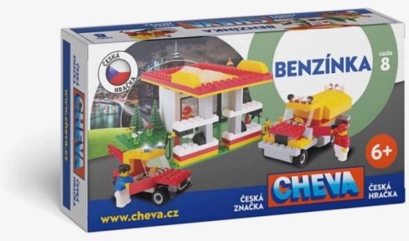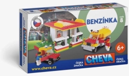 Ontdek de klassieke Tsjechische bouwset CHEVA 8 benzinepomp met 349 onderdelen, die kinderen meeneemt in de wereld van een tankstation, tankwagen en takelwagen. Het variabele systeem van onderdelen stimuleert creativiteit, verbeeldingskracht en handigheid en vult je CHEVA-stad perfect aan.