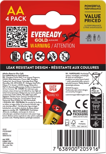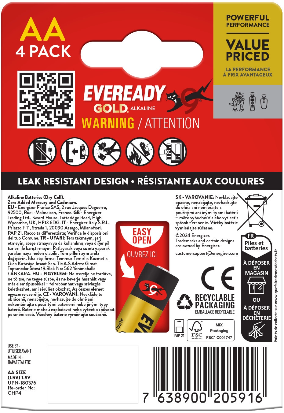 Zoekt u universele voeding voor huishoudelijke elektronica? ENERGIZER Eveready Gold in AA-formaat zijn alkalinebatterijen ontworpen voor betrouwbare werking van apparaten met een normaal tot gemiddeld verbruik. Ze leveren langdurige energie en lagere zelfontlading dan zink-koolstofalternatieven.