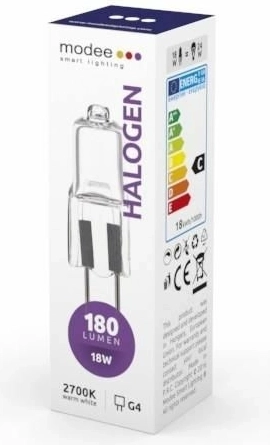 De halogeenlamp MODEE G4 18 W uit de ECO-lijn biedt warmwit licht van 2700 K, directe volledige helderheid en een dimbare lichtstroom. Dankzij de speciale constructie met een IR-reflectielaag en vulling met xenongas levert hij een hogere efficiëntie en een gelijkmatige lichtverdeling in een hoek van 360°.