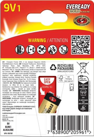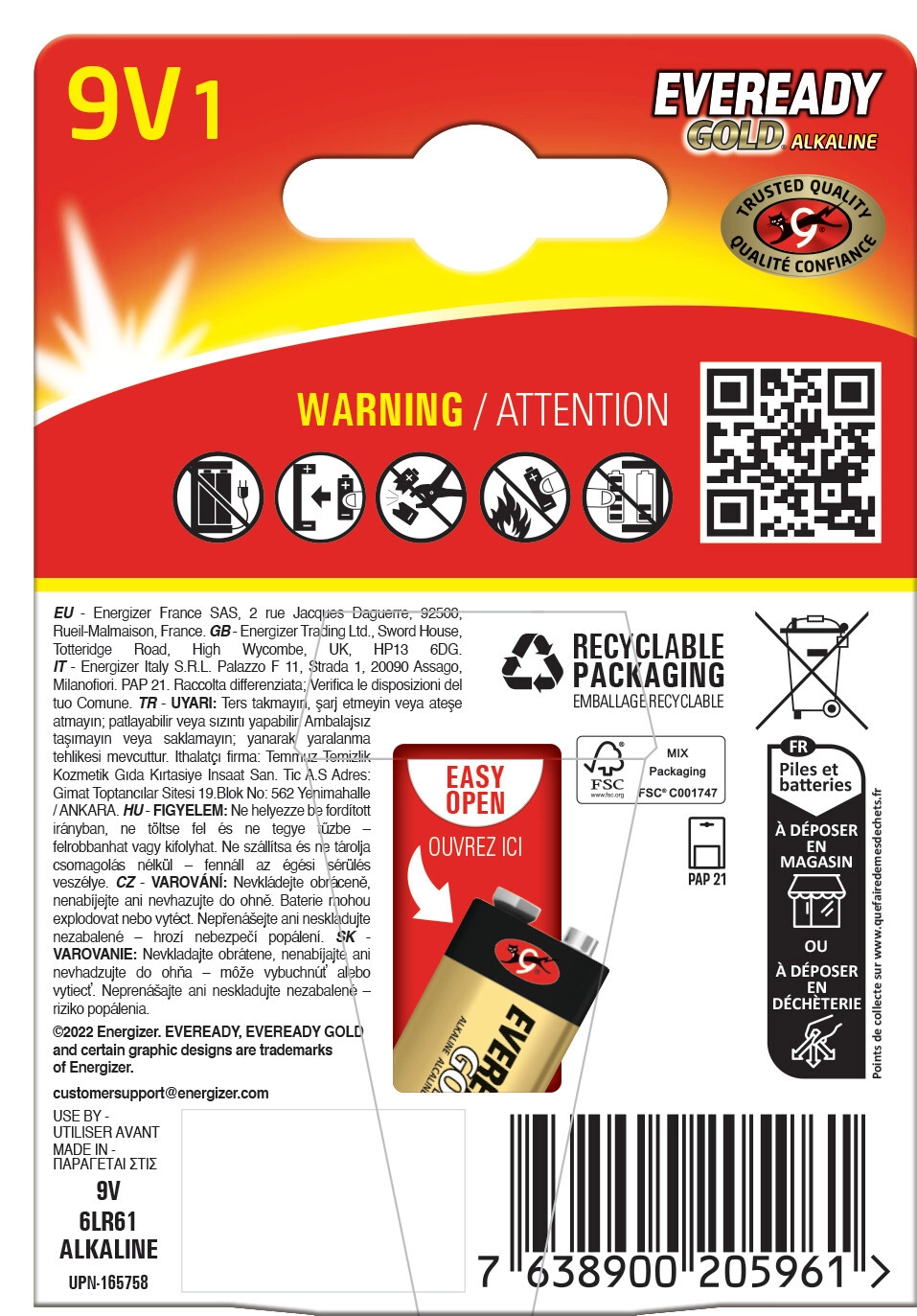 De 9V alkalinebatterij ENERGIZER EVEREADY GOLD is ontworpen om alledaagse huishoudelijke elektronica met gemiddeld verbruik betrouwbaar van stroom te voorzien. Ze combineert een stabiele spanning van 9 V, lange gebruiksduur en verhoogde lekbestendigheid, zodat uw apparaten zorgeloos blijven werken.