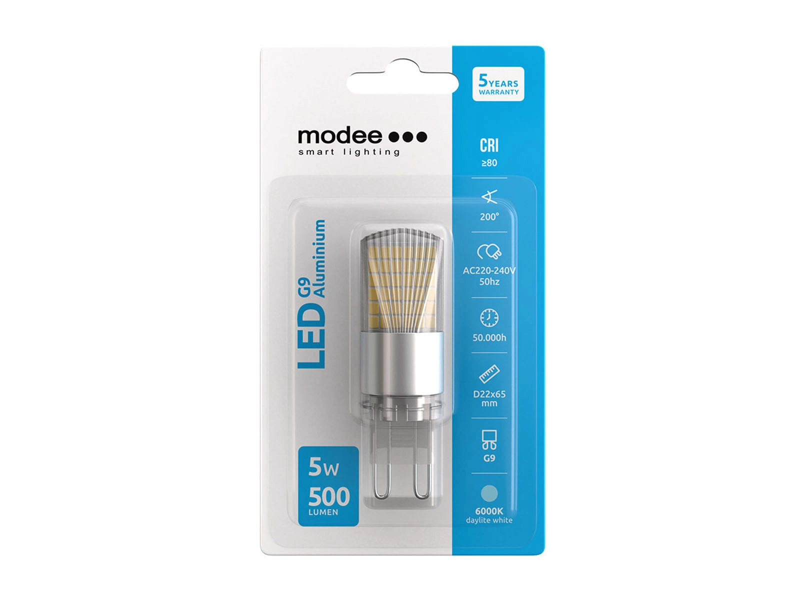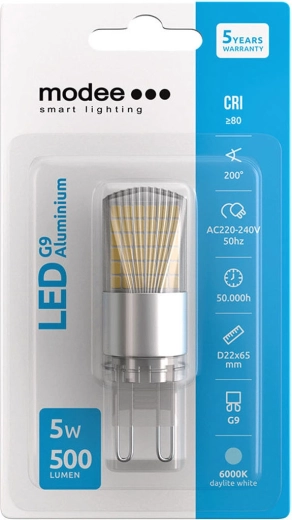 Energiezuinige Modee Smart G9 5 W LED-lamp met koele witte lichtkleur 6000 K biedt een lichtstroom van 500 lm, een brede stralingshoek van 200° en een lange levensduur tot 50.000 u. Dankzij de hoge lichtopbrengst >100 lm/W bespaart hij energie, terwijl de glazen kap en aluminium basis voor betrouwbare werking zorgen.