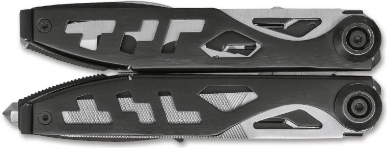 - Praktische uitrusting: deels gekarteld lemmet, houtzaag, vijl met liniaal, multifunctioneel gereedschap met blikopener en flesopener, draadbuiger/-stripper en inbussleutel.