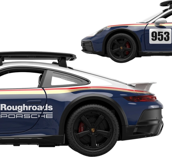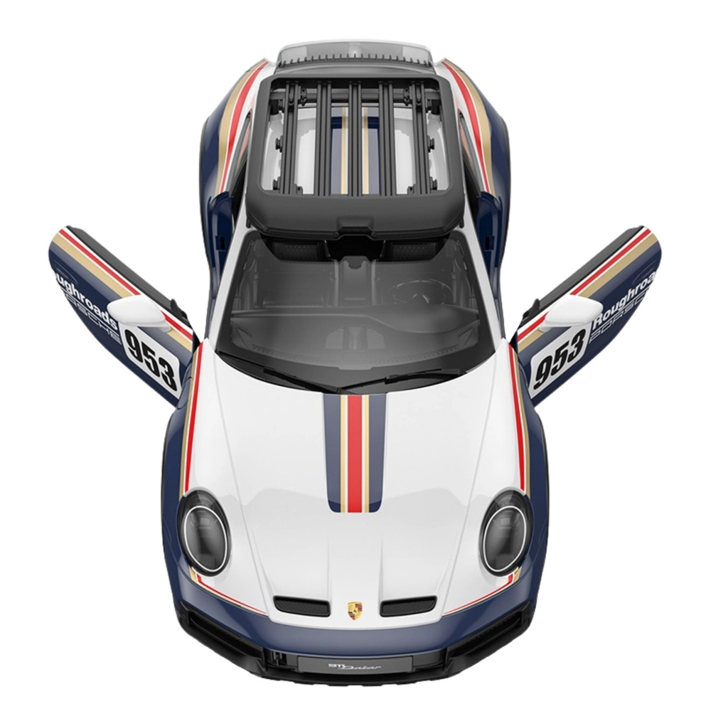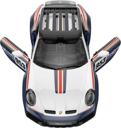 Gedetailleerd exterieur met rallygraphics, nauwkeurige proporties en een knipoog naar de iconische Porsche 953 voor zowel verzamelaars als kinderen.