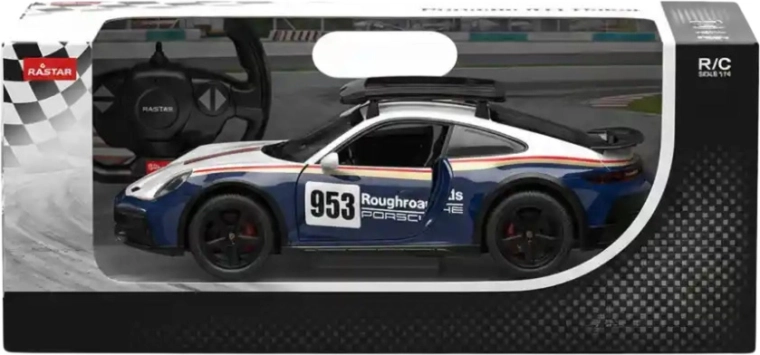 Gelicenseerde R/C auto PORSCHE 911 Dakar van het merk RASTAR in schaal 1:14 biedt een realistische afwerking, soepele besturing op 2,4 GHz en uitstekende rij-eigenschappen. Te openen deuren, LED-verlichting, vierwiel-vering, rubberen banden met hoge grip en een differentiebl garanderen plezier, ook op oneffen terrein. De afneembare dakdrager en de gedetailleerde lak met verwijzing naar de legendarische Porsche 953 zullen zowel verzamelaars als kinderen aanspreken.
