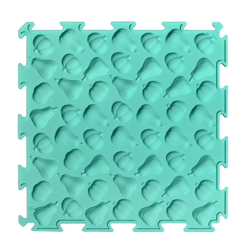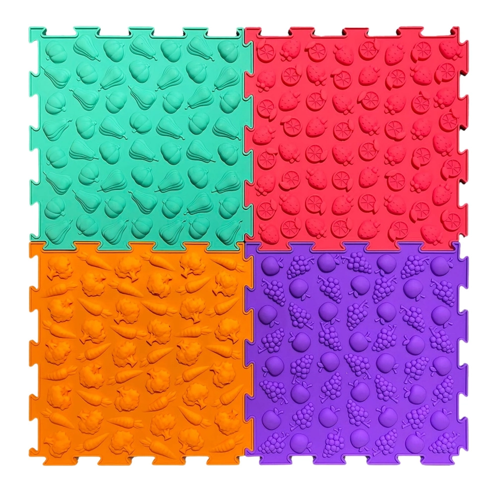 Elke tegel heeft een eigen structuur en reliëf (fruit, groenten en speelse patronen) die de voeten zacht masseren, de bloedcirculatie ondersteunen en de tastzin ontwikkelen.