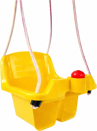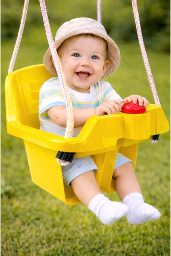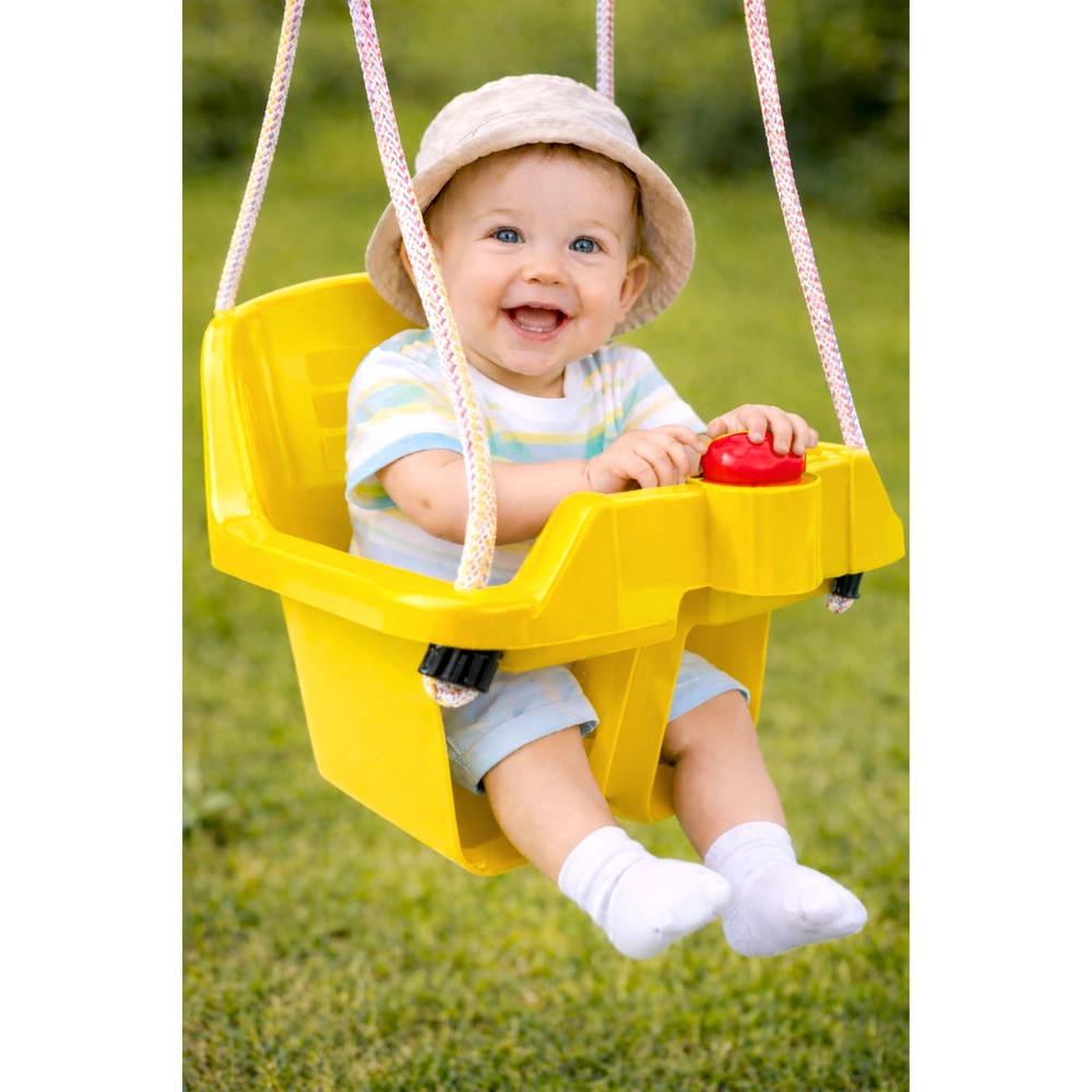 Veilige gele emmer-schommel voor de allerkleinsten met een diepe zitting, een hoge rugleuning en een voorste beugel voor stabiel zitten. Stevige gevlochten touwen zorgen voor betrouwbare ophanging, zowel thuis als in de tuin, en de kleine knop op het blad werkt als een grappige toeter. Maximale belasting 19 kg, CE-certificering en duurzaam kunststof geschikt voor buitengebruik.
