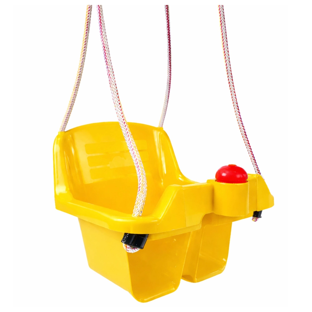 Deze gele emmer-schommel maakt elk peuter blij. De diepe zitting met hoge rugleuning en voorste blokkering houdt het kind in de juiste positie, zodat het veilig kan schommelen, zowel binnen als buiten. Robuuste touwen en duurzaam kunststof met een lange levensduur zijn bestand tegen dagelijks gebruik.