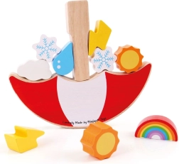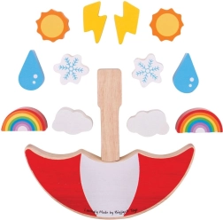 De set bevat 13 onderdelen, waaronder iconische weersymbolen: regenboog, bewolking, sneeuwvlok, druppel, zon en bliksem. Heldere kleuren ondersteunen het herkennen van kleuren en vormen, verantwoord verkregen hout zorgt voor duurzaamheid en een prettig gevoel. Het spel voldoet aan de Europese veiligheidsnormen en is een uitstekende keuze voor kinderen vanaf 2 jaar.