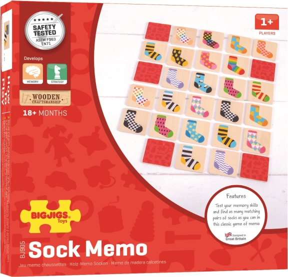 De winnaar is degene die aan het einde de meeste gekoppelde sokken heeft. Het plezier eindigt echter niet, want memory stimuleert ook interactieve spelletjes met andere kinderen, waardoor hun woordenschat vergroot wordt. Het is gemaakt van hoogwaardig hout dat voldoet aan de Europese veiligheidsnormen.