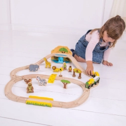 Ontdek de safariwereld met een kleurrijke en stevige houten treinbaan die kinderen vanaf 3 jaar zal bekoren. De set bevat dieren zoals een olifant, zebra en aap, boompjes, bordjes en een brug waarover de gele locomotief met twee wagonnetjes rijdt. Dankzij de magnetische koppelingen is het spel intuïtief en uit te breiden.