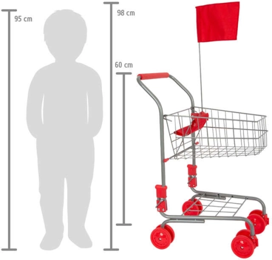 De zilveren kinderwinkelwagen SMALL FOOT in realistisch design valt op door de stabiele metalen constructie, rode accenten en veiligheidsvlaggetje. Dankzij de zwenkende voorwielen is de wagen ook in kleinere ruimtes gemakkelijk te manoeuvreren, zodat kinderen comfortabel kunnen “winkelen” zoals hun ouders.