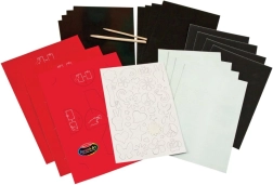 - Inhoud van de set: 16 krasafbeeldingen (ca. 21,5 × 14 cm), 2 houten pennen, sjablonen, 3 standaards voor presentatie.