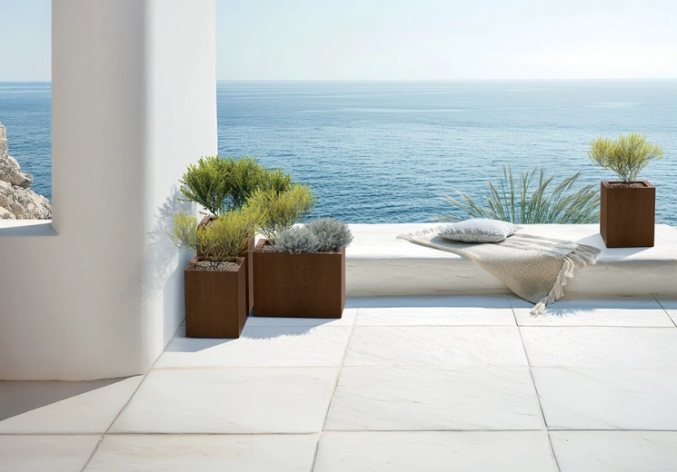 De minimalistische, hoekige vorm in een roestbruine tint combineert prachtig met natuurlijke materialen en accentueert het groen op balkon, terras en in de woonkamer.