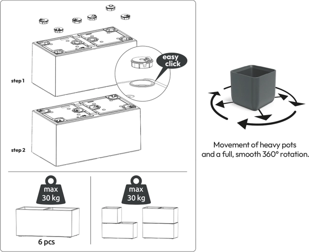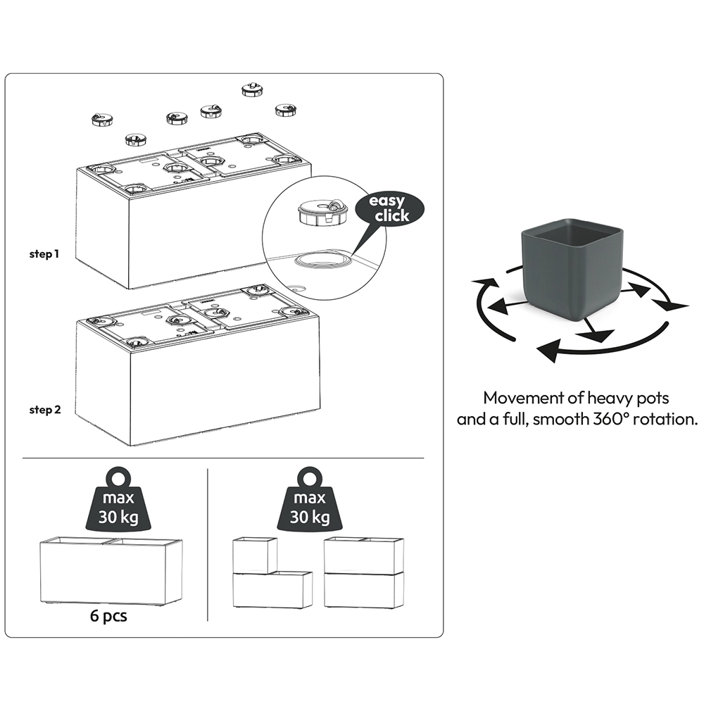 Het geïntegreerde zelfbewateringssysteem houdt de ideale substraatvochtigheid op peil, zodat planten gedijen zelfs bij minder vaak water geven. De pootjes met houtlook zorgen voor stabiliteit, betere ventilatie van de bodem en een elegante uitstraling, zowel op het terras als in de woonkamer.