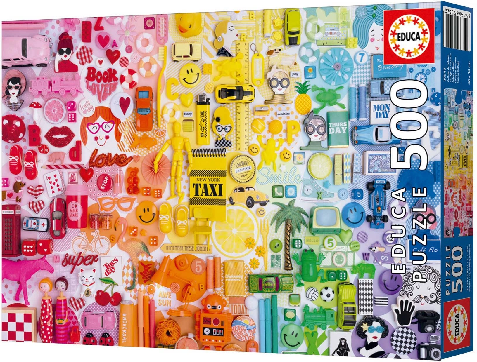 Geniet van ontspanning met de kwalitatieve EDUCA-puzzel van 500 stukjes. Er wacht je een bonte kleurrijke collage, precies passende stukjes en gratis lijm om het voltooide beeld eenvoudig te fixeren. Na het leggen meet de puzzel ongeveer 48 × 34 cm.