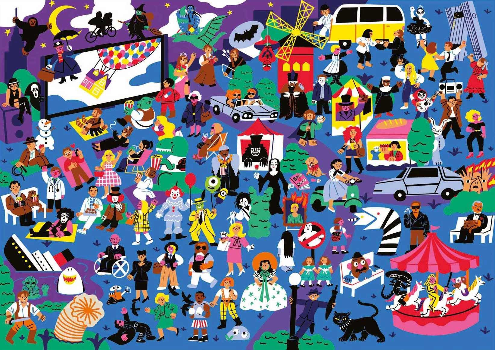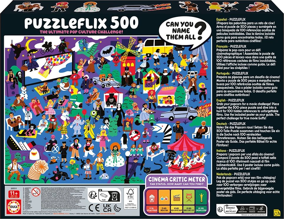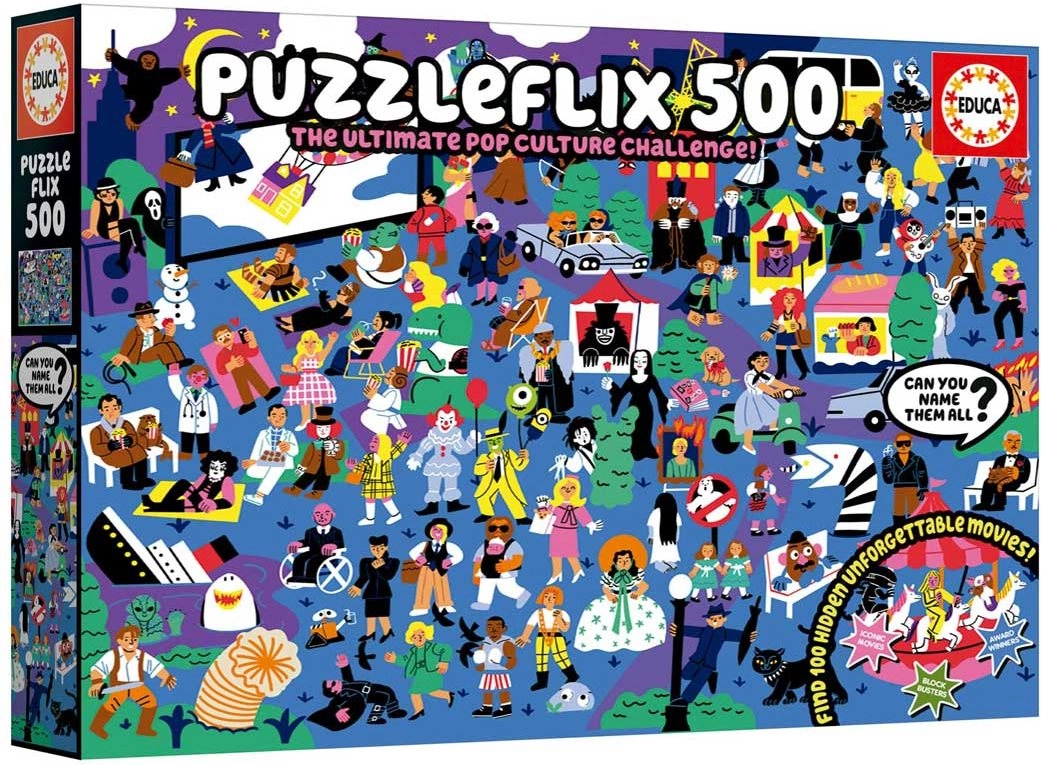 Ontdek de wereld van de cinema met de originele EDUCA Puzzleflix-puzzel. In de afbeelding zitten 100 verwijzingen naar onvergetelijke films verborgen, perfect voor zowel doorgewinterde filmfans als puzzelliefhebbers. De bijgevoegde poster dient als hint en gids zodat je geen enkel detail mist.