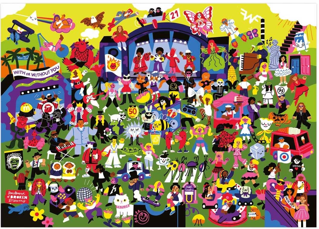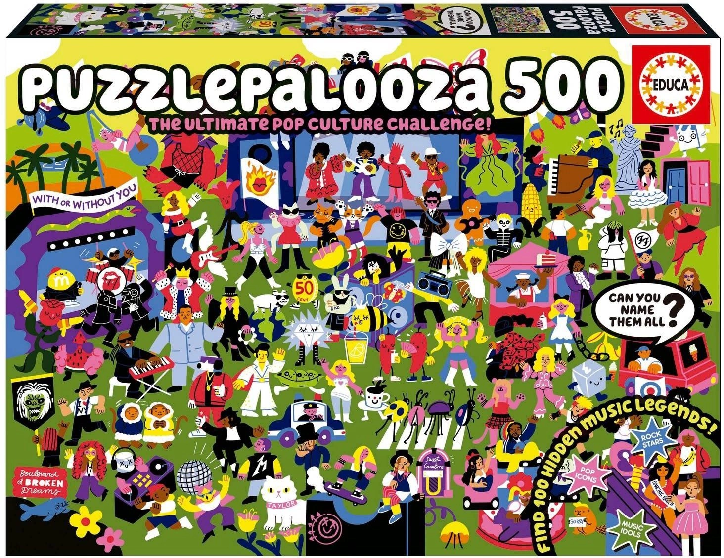 Neem tijd voor jezelf en je familie met de boeiende EDUCA Puzzlepalooza. Na het leggen wacht je een unieke speurtocht: in de illustratie zijn 100 verwijzingen naar beroemde muzikanten en bands verborgen. Met de bijgevoegde poster kun je je laten leiden, of de uitdaging aangaan zonder hints.
