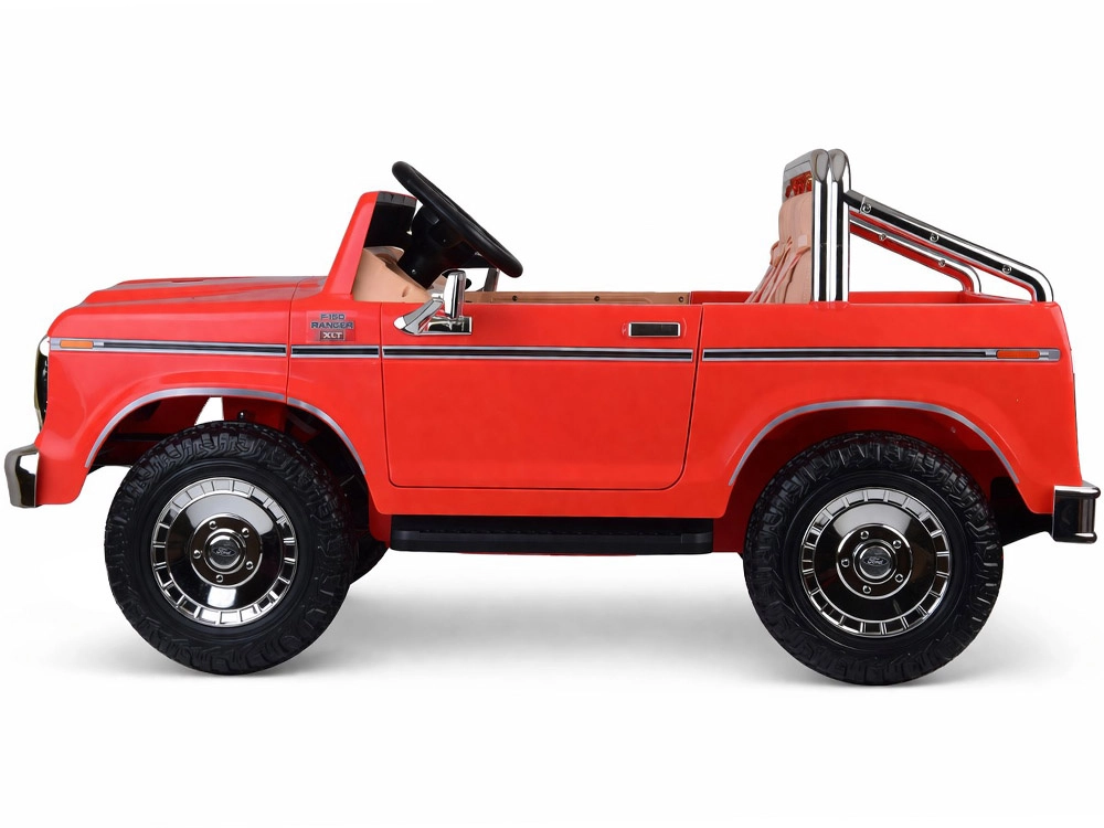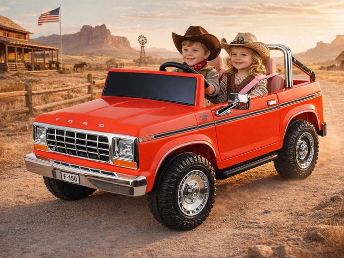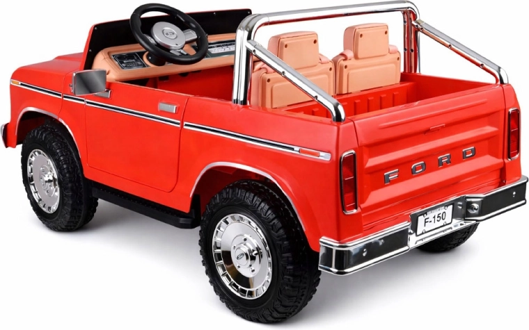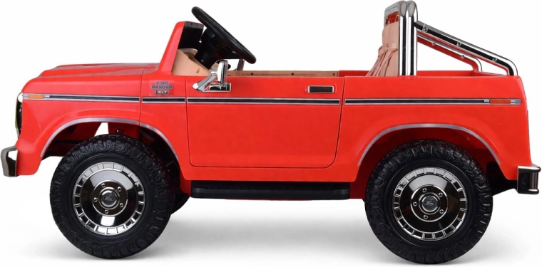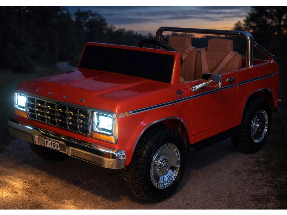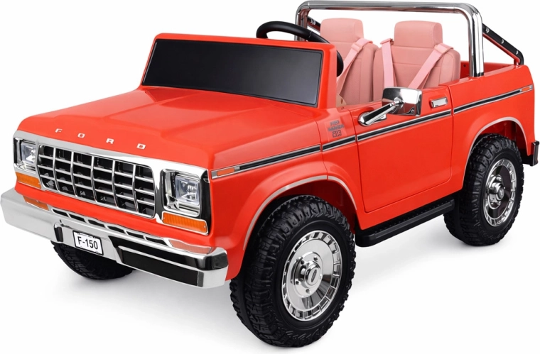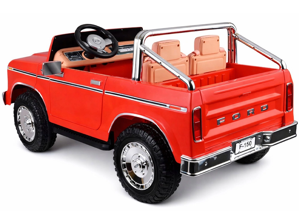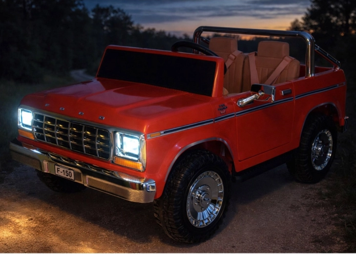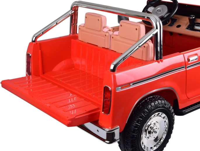 De stijlvolle kinderpick-up, geïnspireerd op de klassieke FORD Bronco, valt op door zijn hoekige silhouet, chroomdetails en realistische afwerking. De comfortabele tweepersoons cabine met een ergonomisch cockpit, duidelijke batterijstatus-indicator en een te openen achterklep/laadbak stimuleert creatief spel en langere ritten.