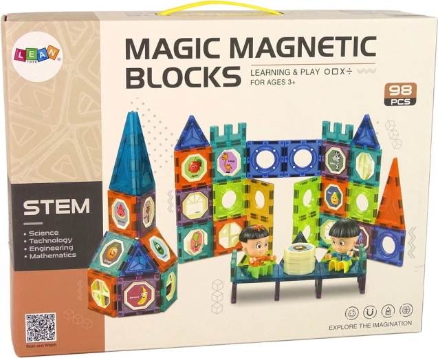Ontdek een creatieve wereld met de magnetische bouwset met 98 delen, waarmee je 3D-constructies kunt bouwen zoals een kasteel of een reuzenrad. Stimuleert de fijne motoriek, het logisch denken en de creativiteit. Onderdelen met magneten en klikverbindingen zijn eenvoudig te koppelen en uit elkaar te halen. Inclusief stickers met dieren, fruit en groenten, 2 figuurtjes en een handleiding. Veilige, duurzame materialen, CE-gecertificeerd, geschikt vanaf 3 jaar.