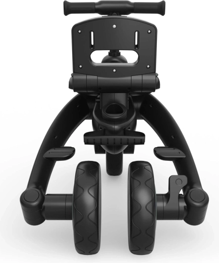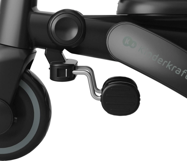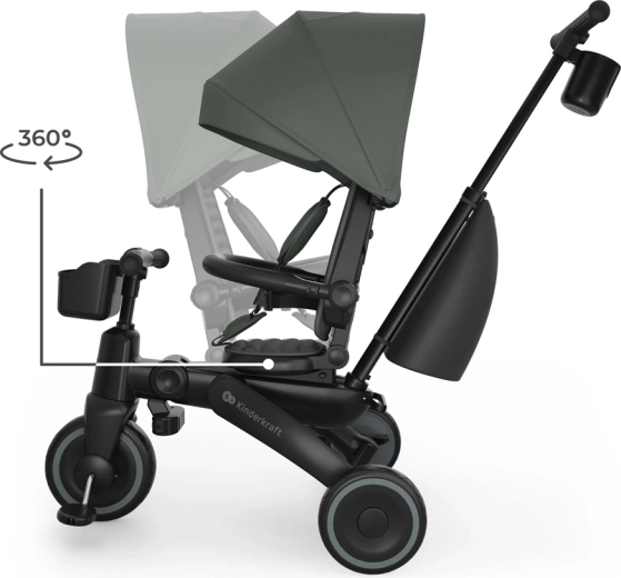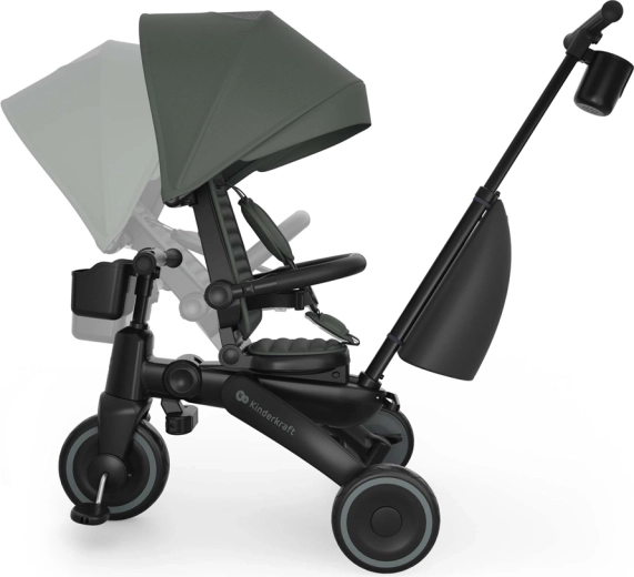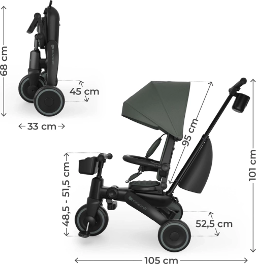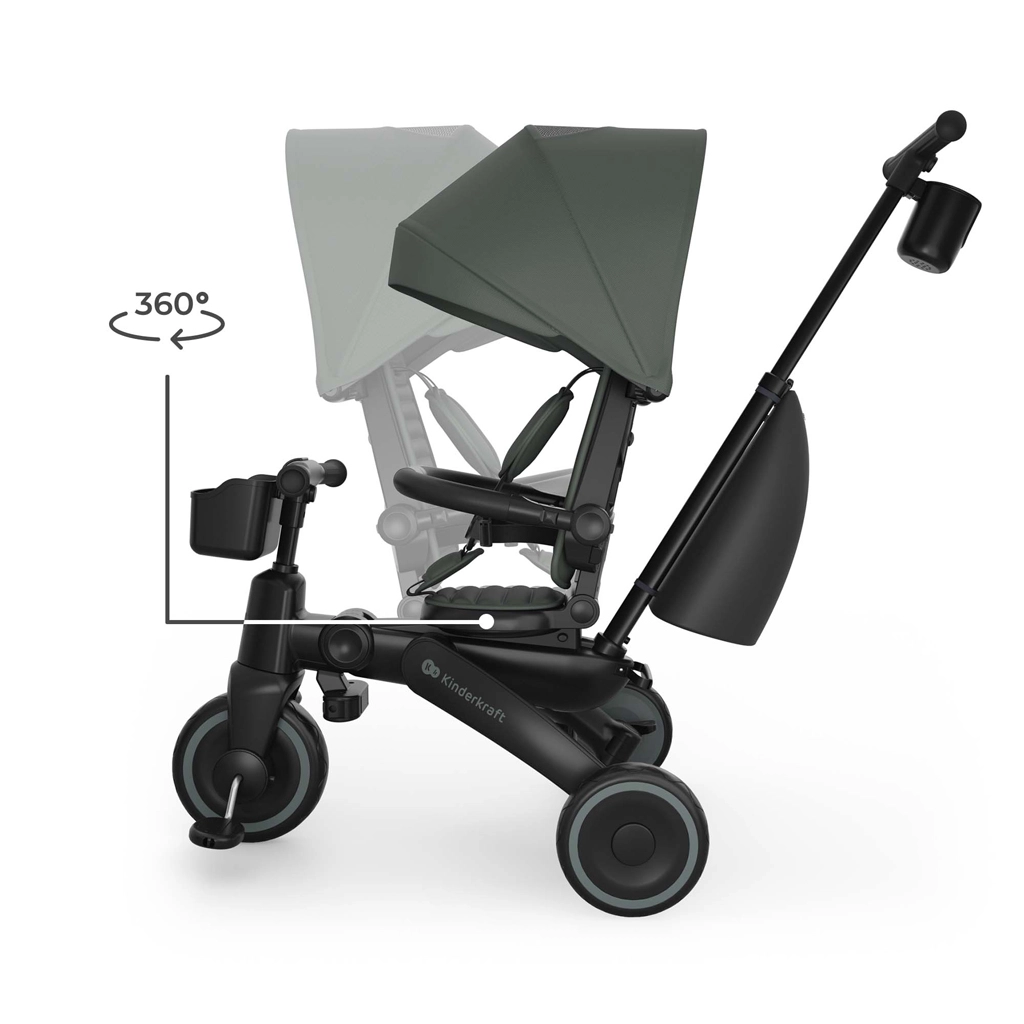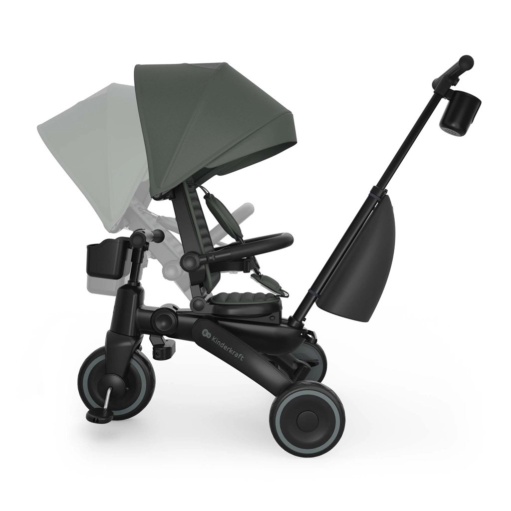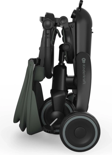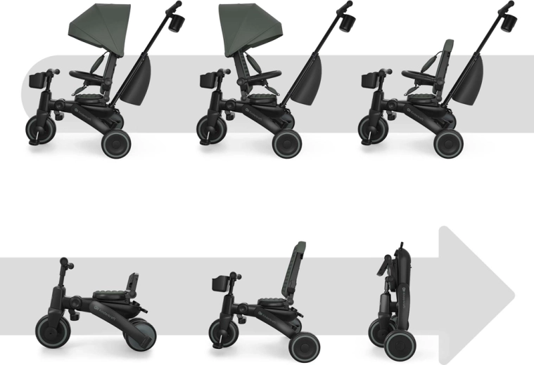 Het opvouwbare frame met dubbele veiligheidsvergrendeling zorgt voor snel en veilig opvouwen tot compacte afmetingen. De driewieler kan stabiel zowel verticaal als horizontaal worden opgeborgen – handig in huis, lift en kofferbak. De grote kap met UPF 50+-filter en waterafstotende coating beschermt tegen zon en lichte regen; het ventilatiepaneel en het peek-a-boo kijkvenster verbeteren de luchtstroom en het contact met je kind.